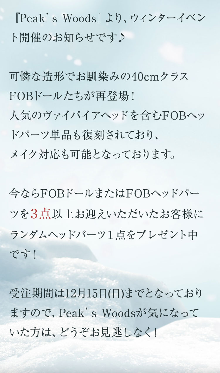 The 40cm class FOB dolls, known for their lovely design, are back again! Individual FOB head parts, including the popular Vaipire head, have also been reissued, and makeup is also available. We are currently offering a free random head part for customers who purchase three or more FOB dolls or FOB head parts! The order period is until (Sun), December 15th, so if you've been interested in Peak's Woods, don't miss out!