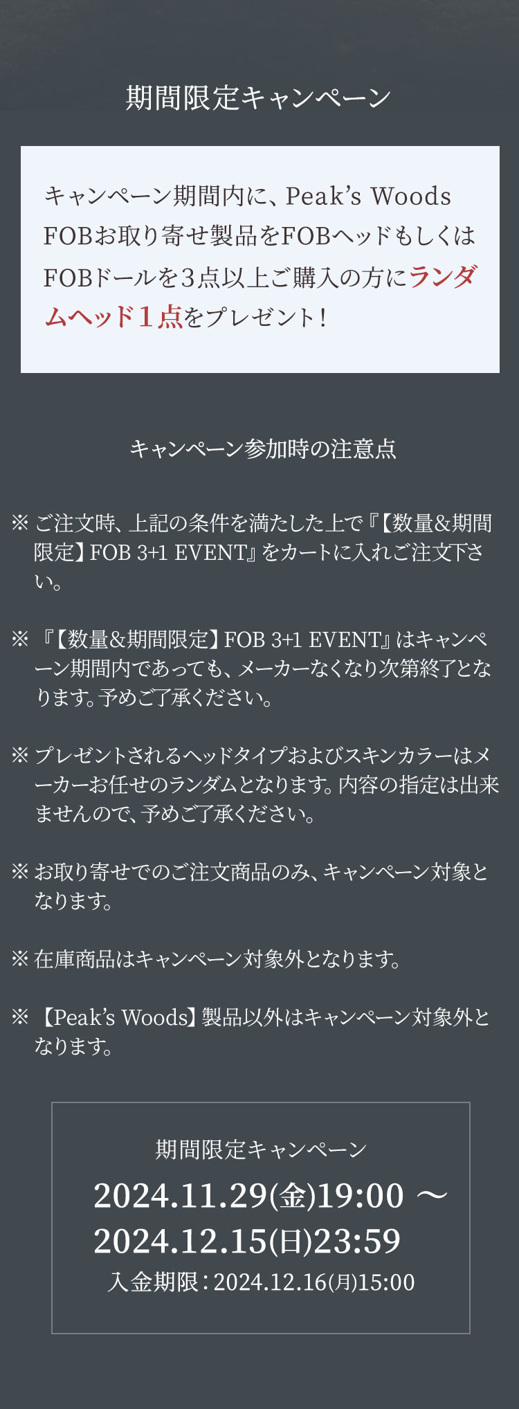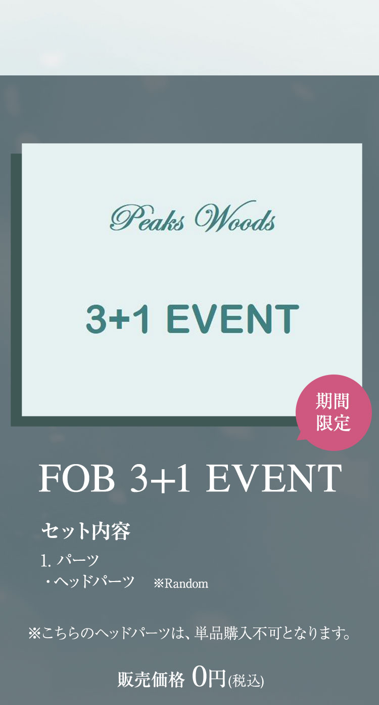During the campaign period, if you purchase 3 or more Peak's Woods FOB heads or FOB dolls, you will receive a random head as a gift!