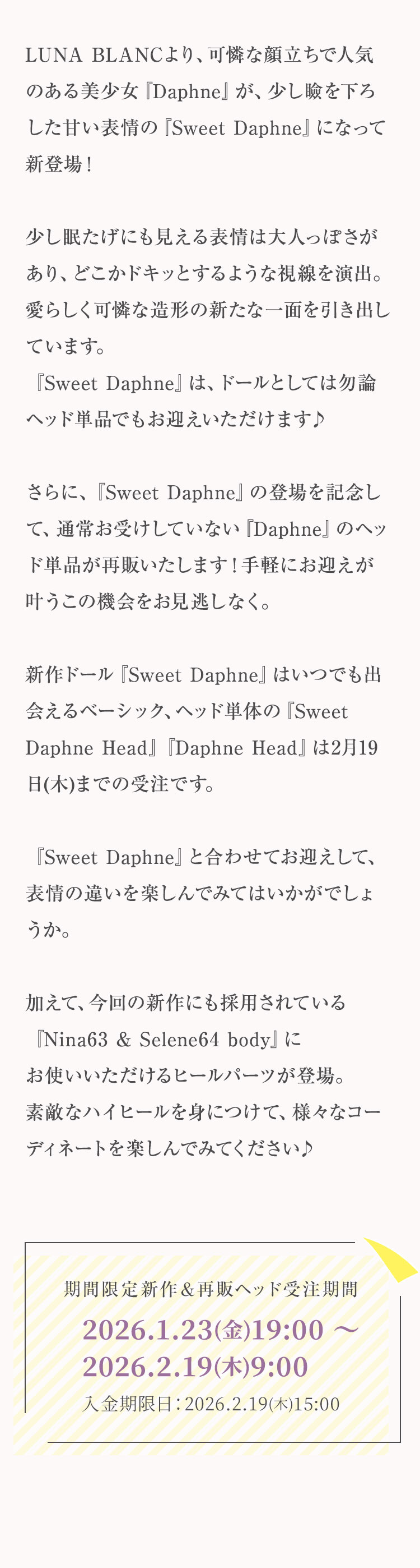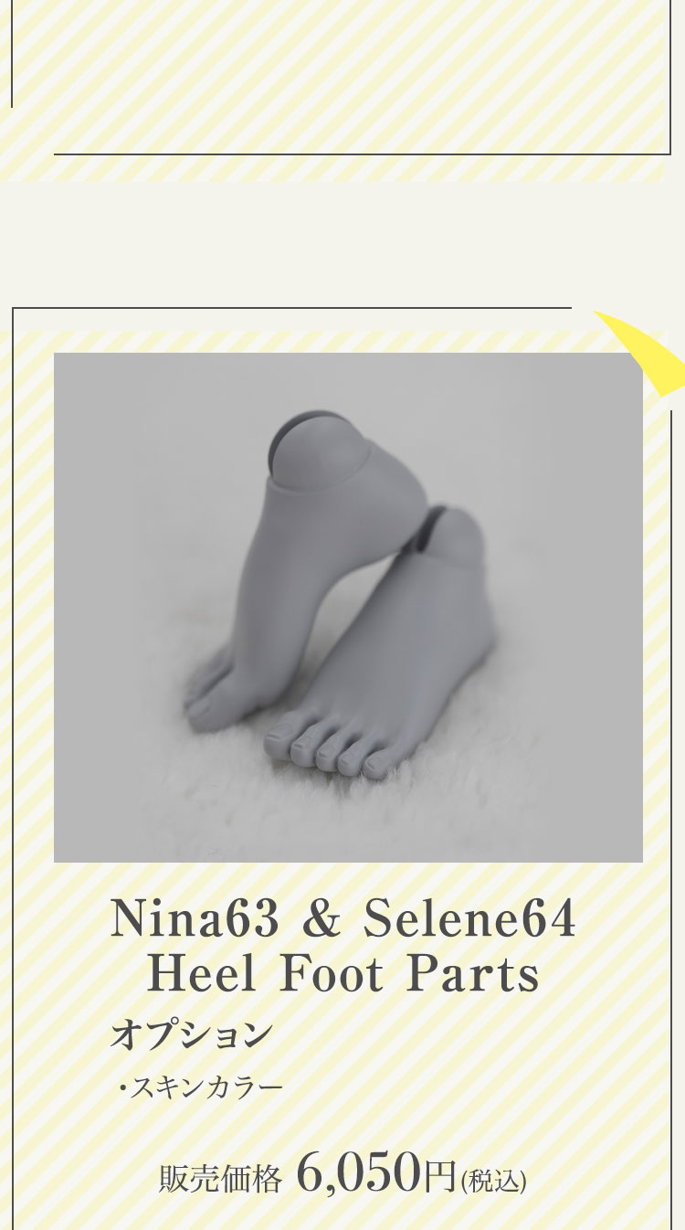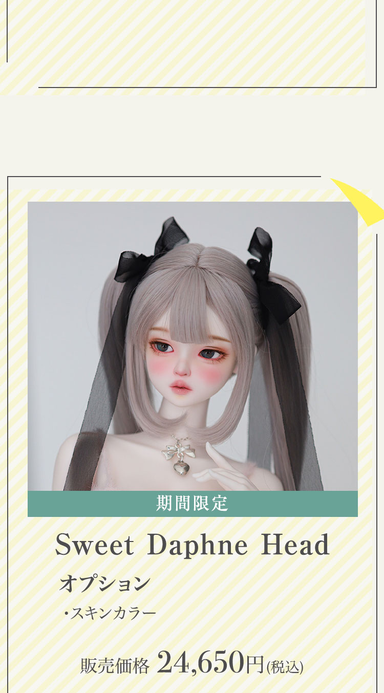 少し眠たげにも見える表情は大人っぽさがあり、どこかドキッとするような視線を演出。 愛らしく可憐な造形の新たな一面を引き出しています。 『Sweet Daphne』は、ドールとしては勿論ヘッド単品でもお迎えいただけます♪ さらに、『Sweet Daphne』の登場を記念して、通常お受けしていない『Daphne』のヘッド単品が再販いたします! 手軽にお迎えが叶うこの機会をお見逃しなく。 新作ドール『Sweet Daphne』はいつでも出会えるベーシック、 ヘッド単体の『Sweet Daphne Head』『Daphne Head』は2月19日(木)までの受注です。 『Sweet Daphne』と合わせてお迎えして、表情の違いを楽しんでみてはいかがでしょうか。 加えて、今回の新作にも採用されている『Nina63 & Selene64 body』にお使いいただけるヒールパーツが登場。 素敵なハイヒールを身につけて、様々なコーディネートを楽しんでみてください♪