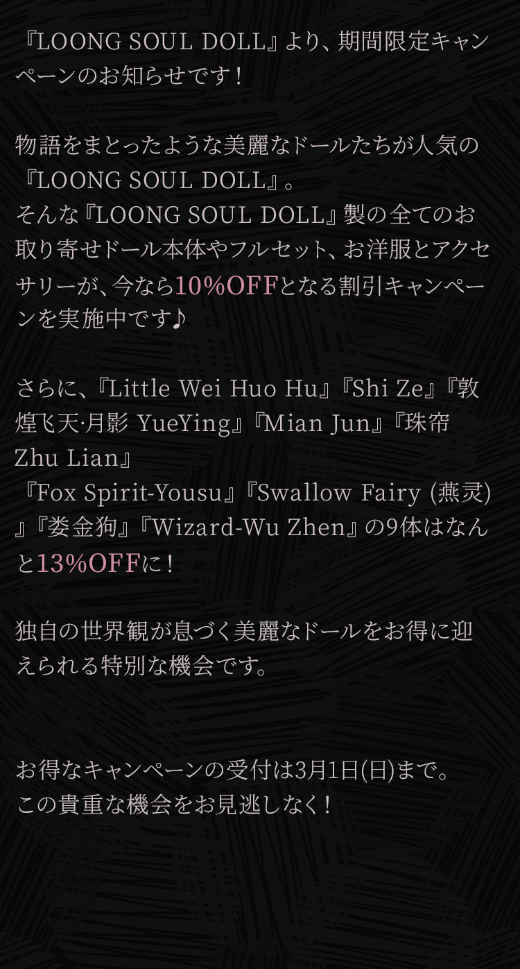キャンペーン期間中、LOONG SOUL DOLL製お取り寄せドール本体及びフルセット、ボディ、アウトフィット、アクセサリーが定価より【10%OFF】! 『Little Wei Huo Hu』『Shi Ze』『敦煌飞天·月影 YueYing』『Mian Jun』『珠帘 Zhu Lian』『Fox Spirit-Yousu』『Swallow Fairy (燕灵)』『娄金狗』『Wizard-Wu Zhen』が定価より【13%OFF】!