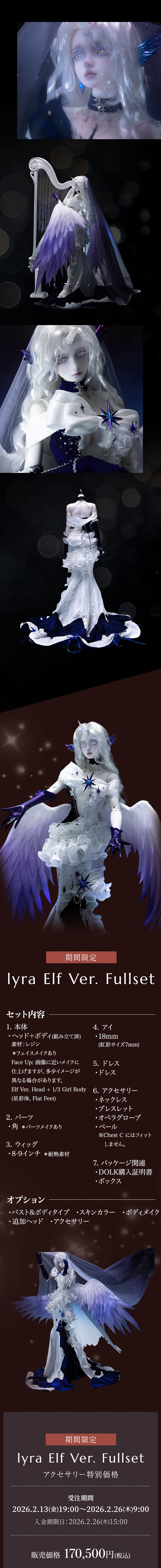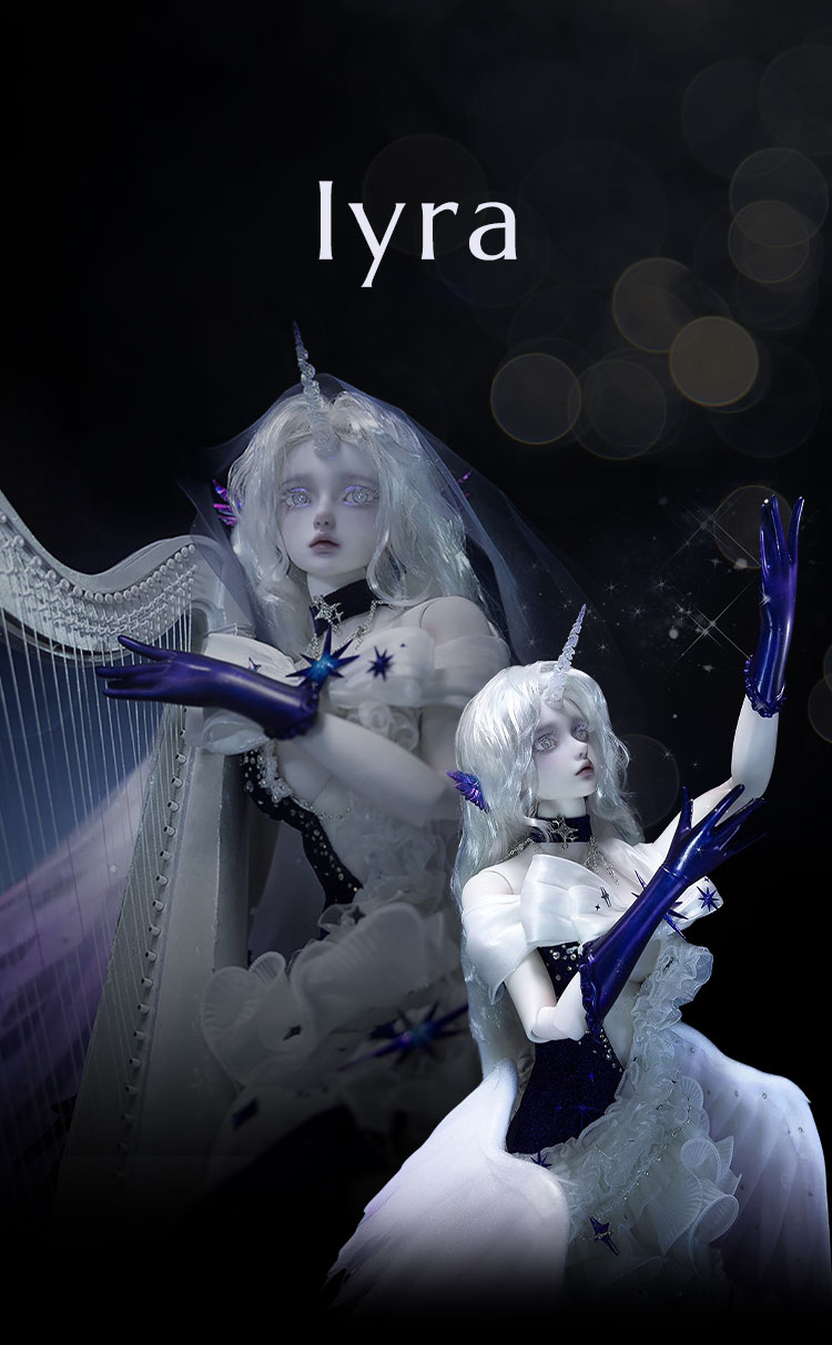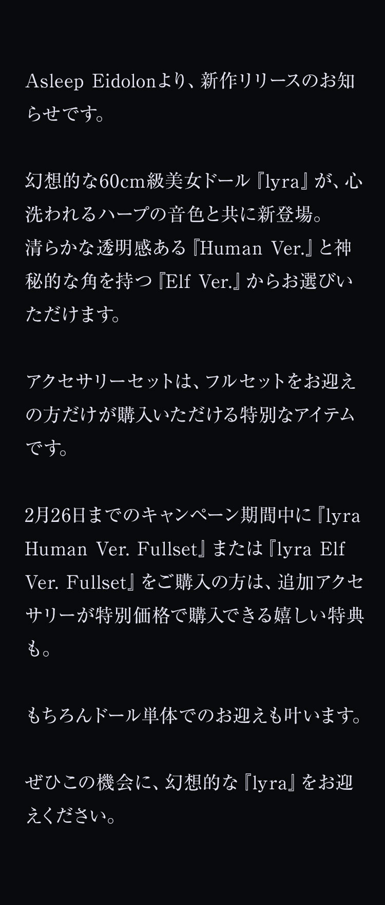 幻想的な60cm級美女ドール『lyra』が、心洗われるハープの音色と共に新登場。 清らかな透明感ある『Human Ver.』と神秘的な角を持つ『Elf Ver.』からお選びいただけます。 アクセサリーセットは、フルセットをお迎えの方だけが購入いただける特別なアイテムです。 2月26日までのキャンペーン期間中に『lyra Human Ver. Fullset』または『lyra Elf Ver. Fullset』をご購入の方は、追加アクセサリーが特別価格で購入できる嬉しい特典も。 もちろんドール単体でのお迎えも叶います。 ぜひこの機会に、幻想的な『lyra』をお迎えください。