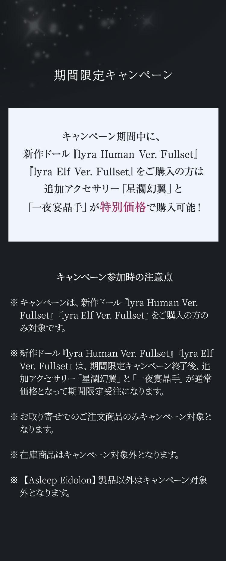 キャンペーン期間中に、新作ドール『lyra Human Ver. Fullset』『lyra Elf Ver. Fullset』をご購入の方は追加アクセサリー「星瀾幻翼」と「一夜宴晶手」が【特別価格】で購入可能!