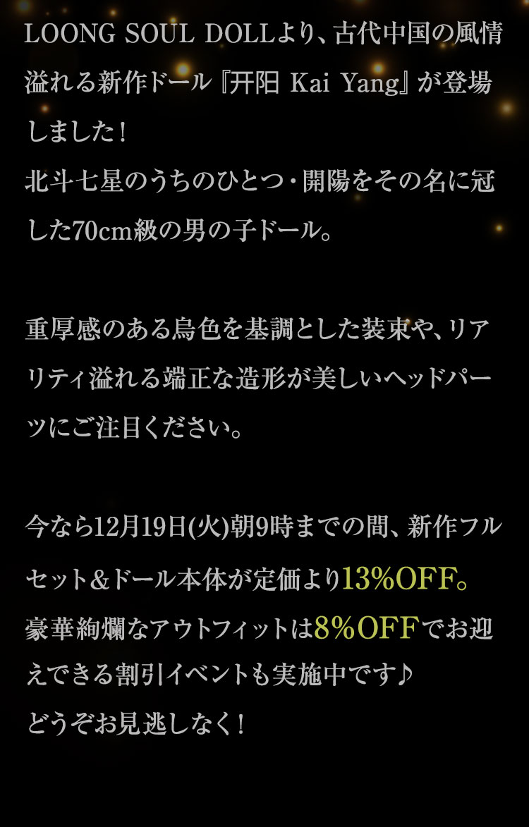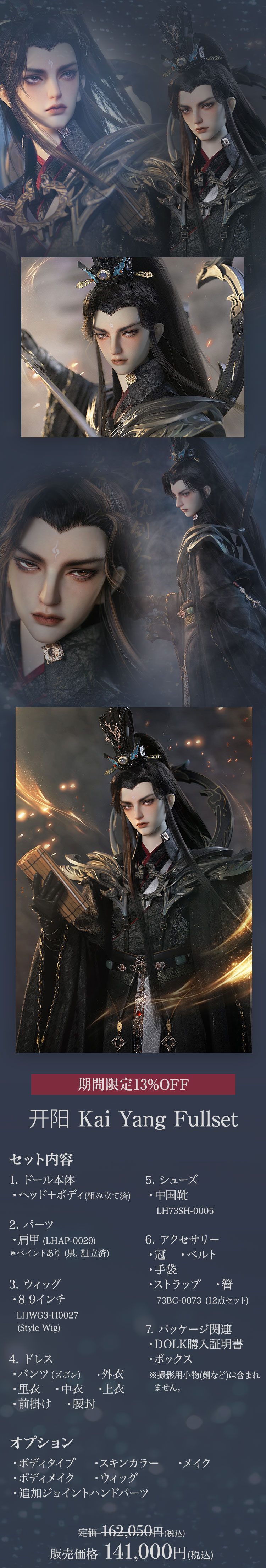 A 70cm boy doll named after Kaiyo, one of the Big Dipper stars. Please take a look at the heavy, crow-colored outfit and the beautiful, realistic, and neatly sculpted head parts. Right now, until 9am on (Tue) December 19th, we are holding a discount event where you can get the new full set and Doll for 13% off the regular price, and the gorgeous outfit for 8% off. Don't miss out!