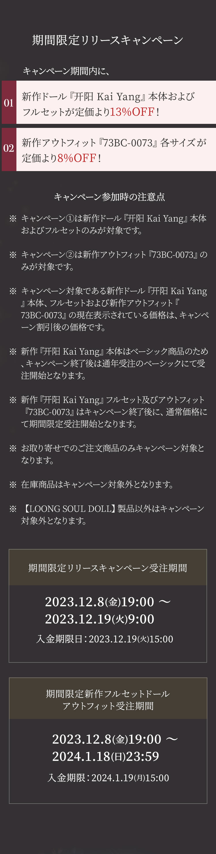During the campaign period, 1) the new doll "Kai Yang" and the full set are 13% off the regular price! 2) the new outfit "73BC-0073" in all sizes are 8% off the regular price!