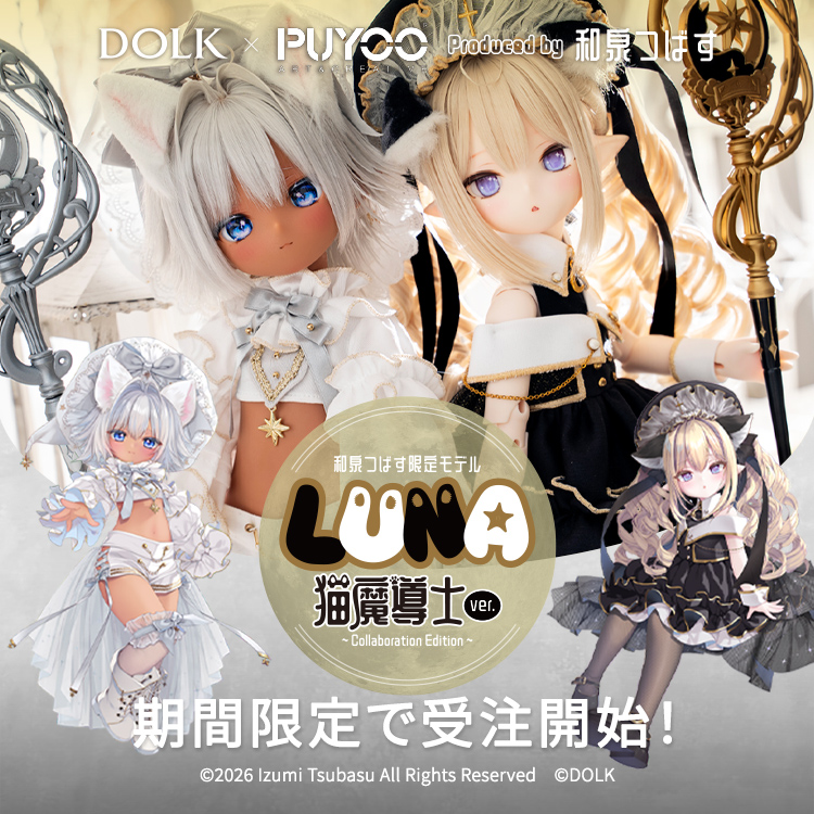 アニメ・ゲーム業界で第一線を走り続けるイラストレーターでありながらドールとイラストが響きあう独自の展示会を手掛けるなど、ドールへの深い愛情と、確かな美学を持つ「和泉つばす」氏。その和泉 氏が長年魅了され続けてきたドールメーカー・PUYOO DOLLと名だたる実力派アーティスト達が集結し、完全新作「LUNA」が誕生しました。和泉つばす氏がプロデュースする幻想的な世界観をFloralGarden、chatora、ふにゃほわ、CALULU、あいまいみどるという錚々たる面々が、緻密な造形と彩りで可憐な猫魔導士へと昇華させています。至高の才能が響きあい、一筋の光のように紡がれた奇跡の造形美。月の光に導かれた「LUNA」の姿を、どうぞご覧ください。