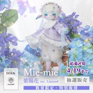 紫陽花 Mie-mie が牡羊座シーズンを記念して特別復刻!立体的な睫毛造形や、可愛いボディのデザインで大人気の羊ドールMie-mie。本コラボでは大人気アーティストHeebom(ヒボム)氏と、初コラボのドールドレスメーカーAtelier Pinaがタッグを組み、梅雨の季節にしか出会えない紫陽花Mie-mieが誕生しています。Heebom(ヒボム)氏による鮮やかな限定メイクは、Mie-mieの造形を最大限に生かし、ターコイズ、パープル、ピンク、ブルーの複雑な色彩が織りなす紫陽花の様子を美しく表現しています。さらに、メイクとぴったりなアイは虹彩の中に青空が広がり、雲が浮かぶ表現がほどこされたBeautiful Mentalworldの作品をお届け。さらに、DOLK初コラボレーションを飾るAtelier Pinaによるドレスセットは、ヘッドドレスや羊のドロワーズに飾られた紫陽花のお花まで、ひとつひとつを丁寧にカットして制作するなど、非常に手間のかけられた特注ドレスが楽しめます。紫陽花とMie-mieが融合した唯一無二の造形美。透明感あふれる梅雨のひとときを閉じ込めた姿をご覧ください。