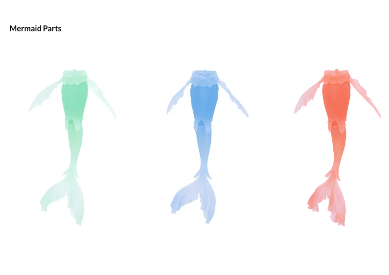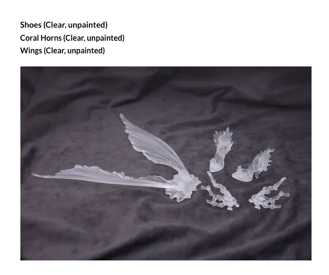 The four parts are made up of mermaid parts, Coral Horns parts, shoes and wings.