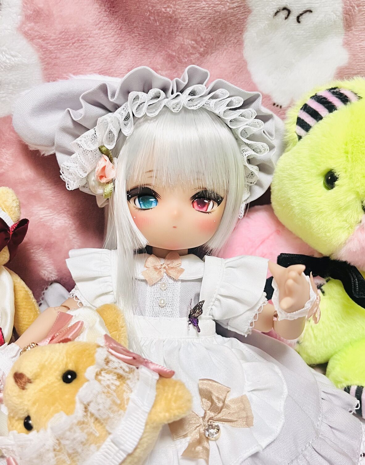 Popular artist NayeONE has created a limited edition of small anime eyes to fit the eye holes of Guru, which is relatively small for an anime doll at 7-8 inches. A little fairy-like maid has been born with rabbit-like red eyes and a special green odd-eye configuration.