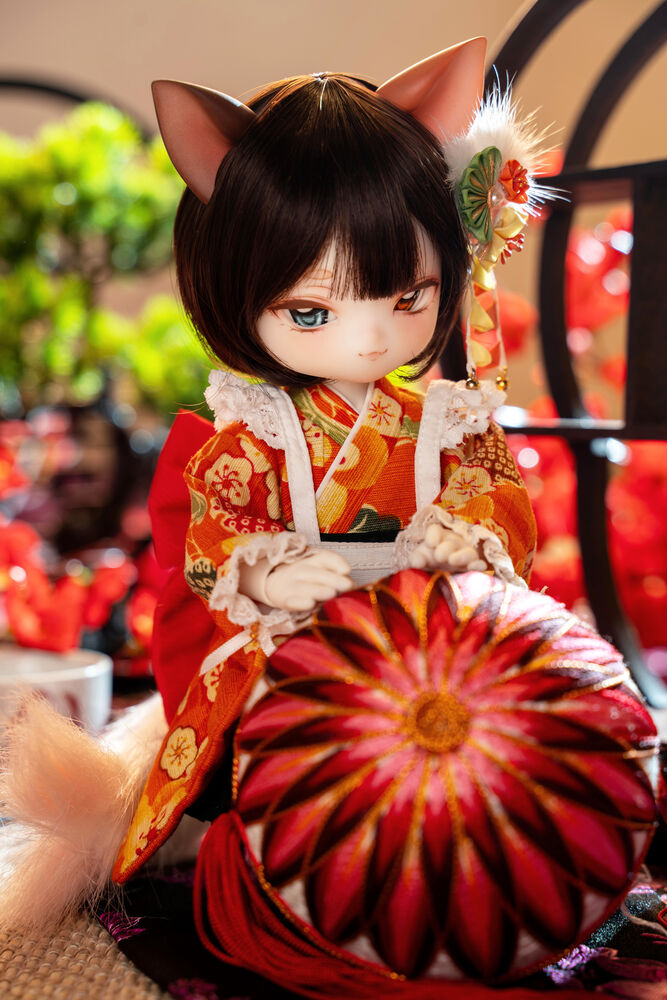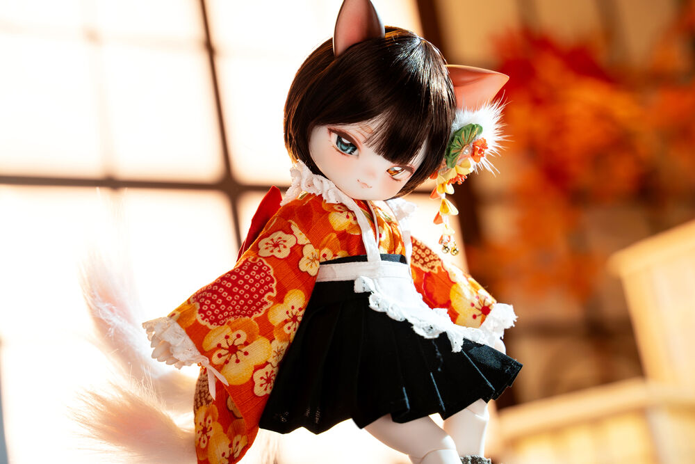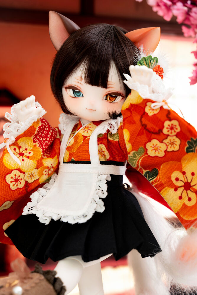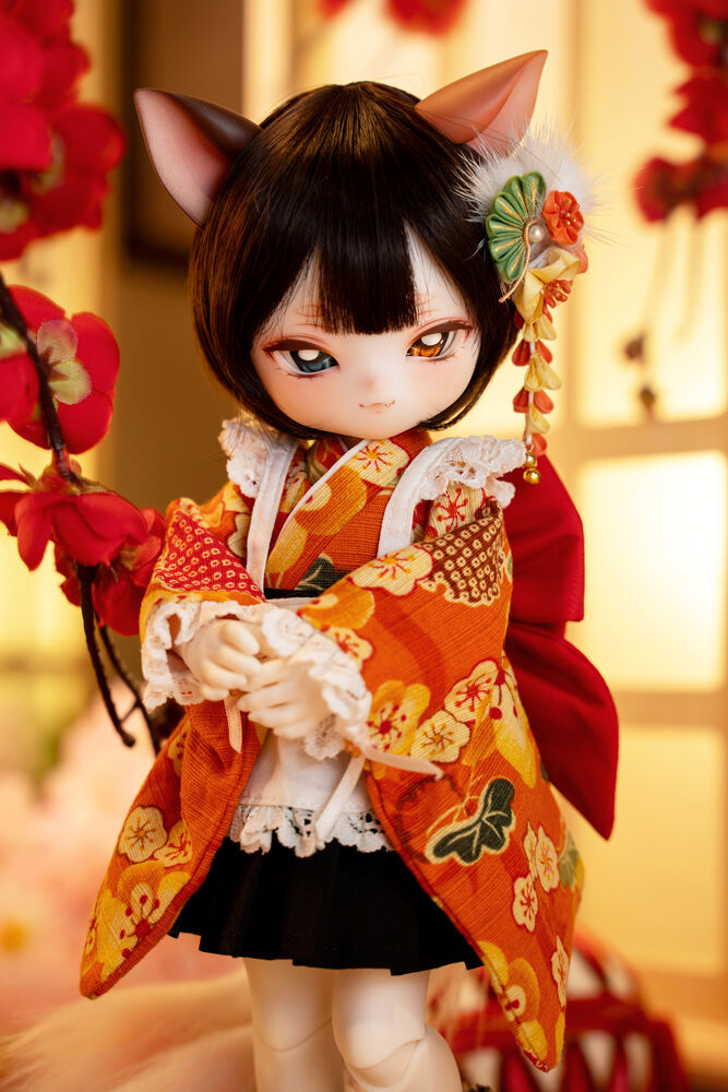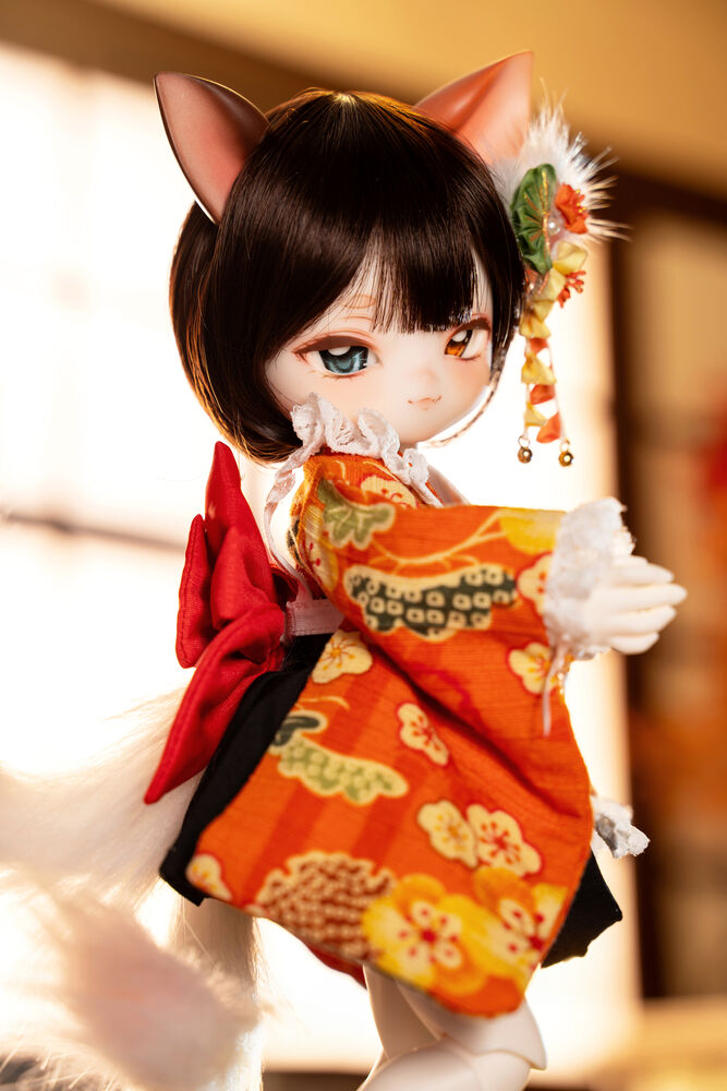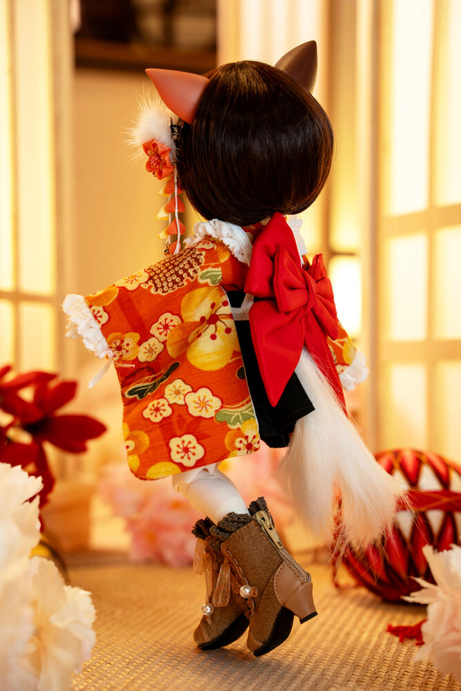 MYU's small 30cm body size has been beautifully crafted with attention to detail, including a kimono top that reproduces the light brown calico cat's fur, which can also be seen as orange, and the two tails that are essential to a nekomata.