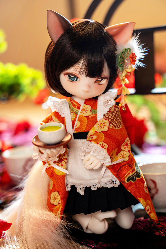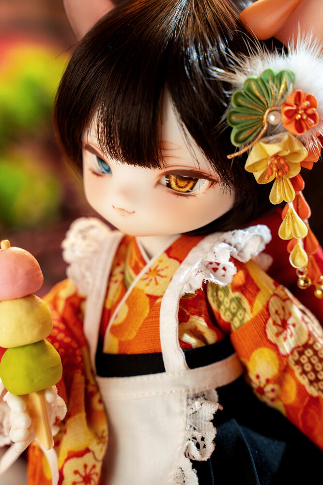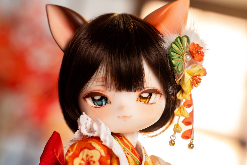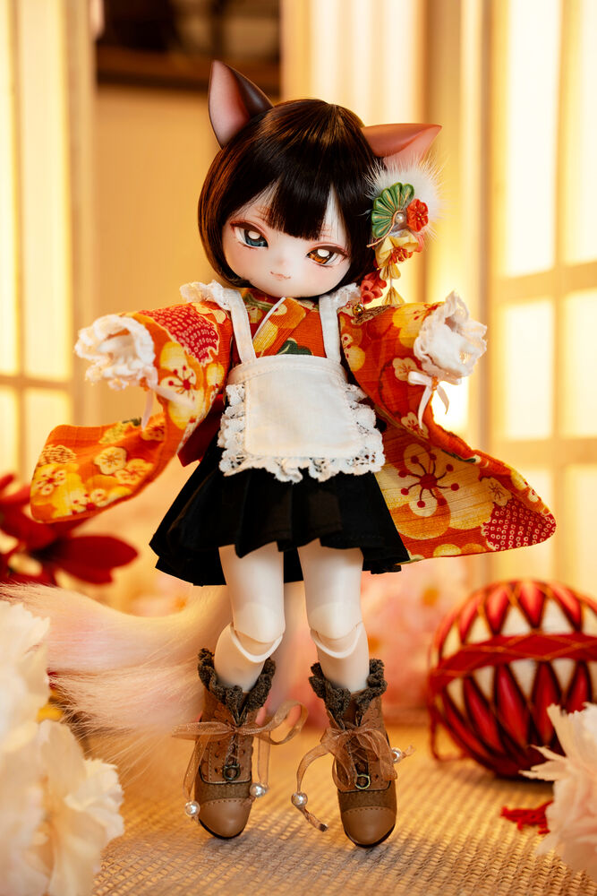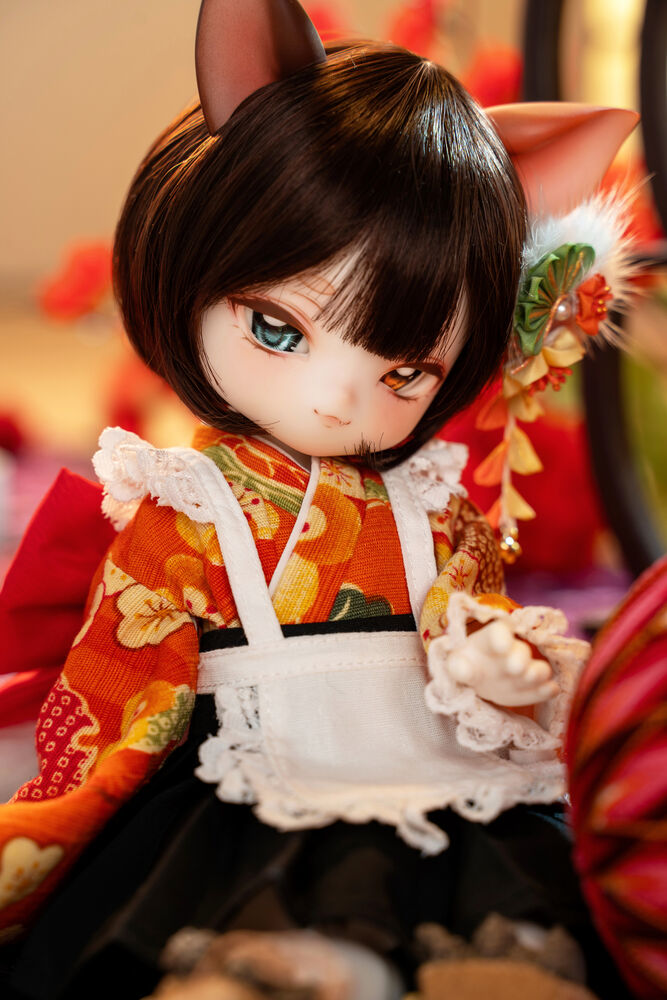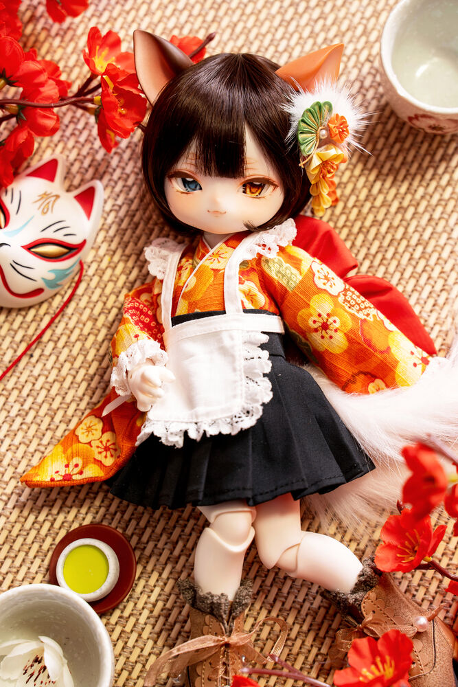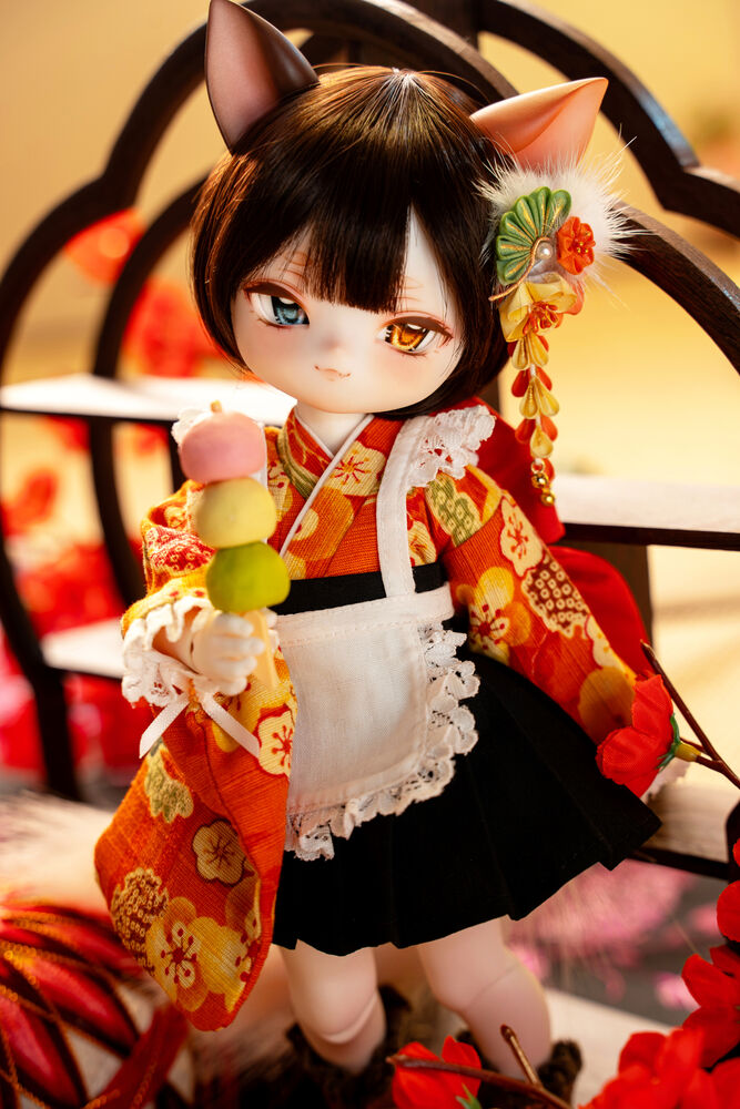 MYU's small 30cm body size has been beautifully crafted with attention to detail, including a kimono top that reproduces the light brown calico cat's fur, which can also be seen as orange, and the two tails that are essential to a nekomata.