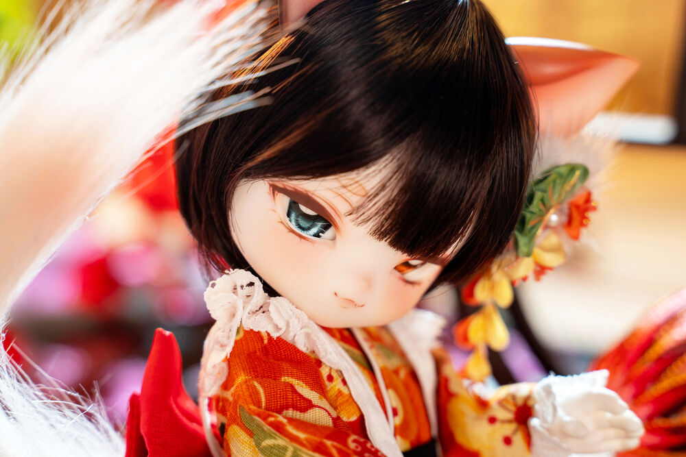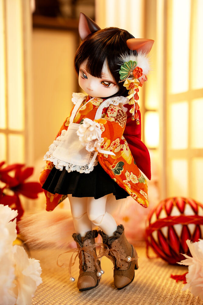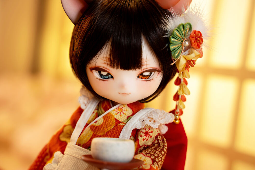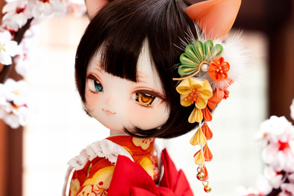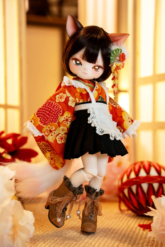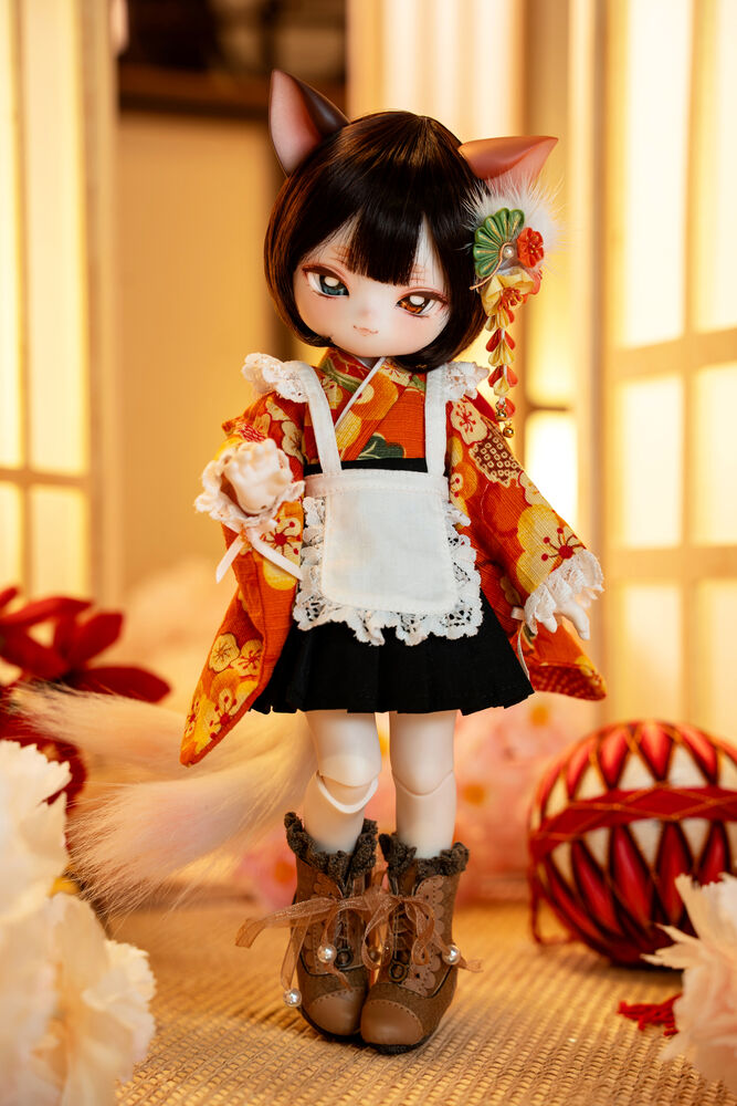 MYU's small 30cm body size has been beautifully crafted with attention to detail, including a kimono top that reproduces the light brown calico cat's fur, which can also be seen as orange, and the two tails that are essential to a nekomata.