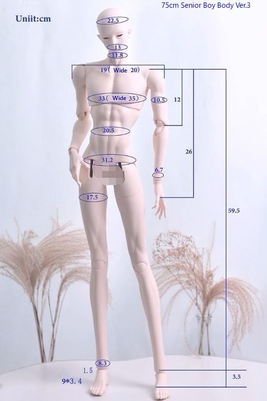 | 75cm Senior Ver.3: Standard (Sosandai body narrow shoulders) | 75 | 22.5 | 13 | 19 | 33 | 20.5 | 31.2 | 26 | 6.7 | --- | 17.5 | 9 | 3.4 | 8~9 | 14 | |