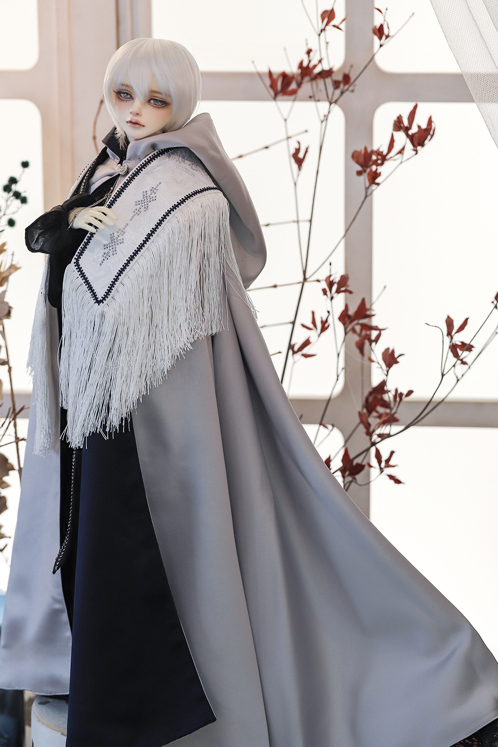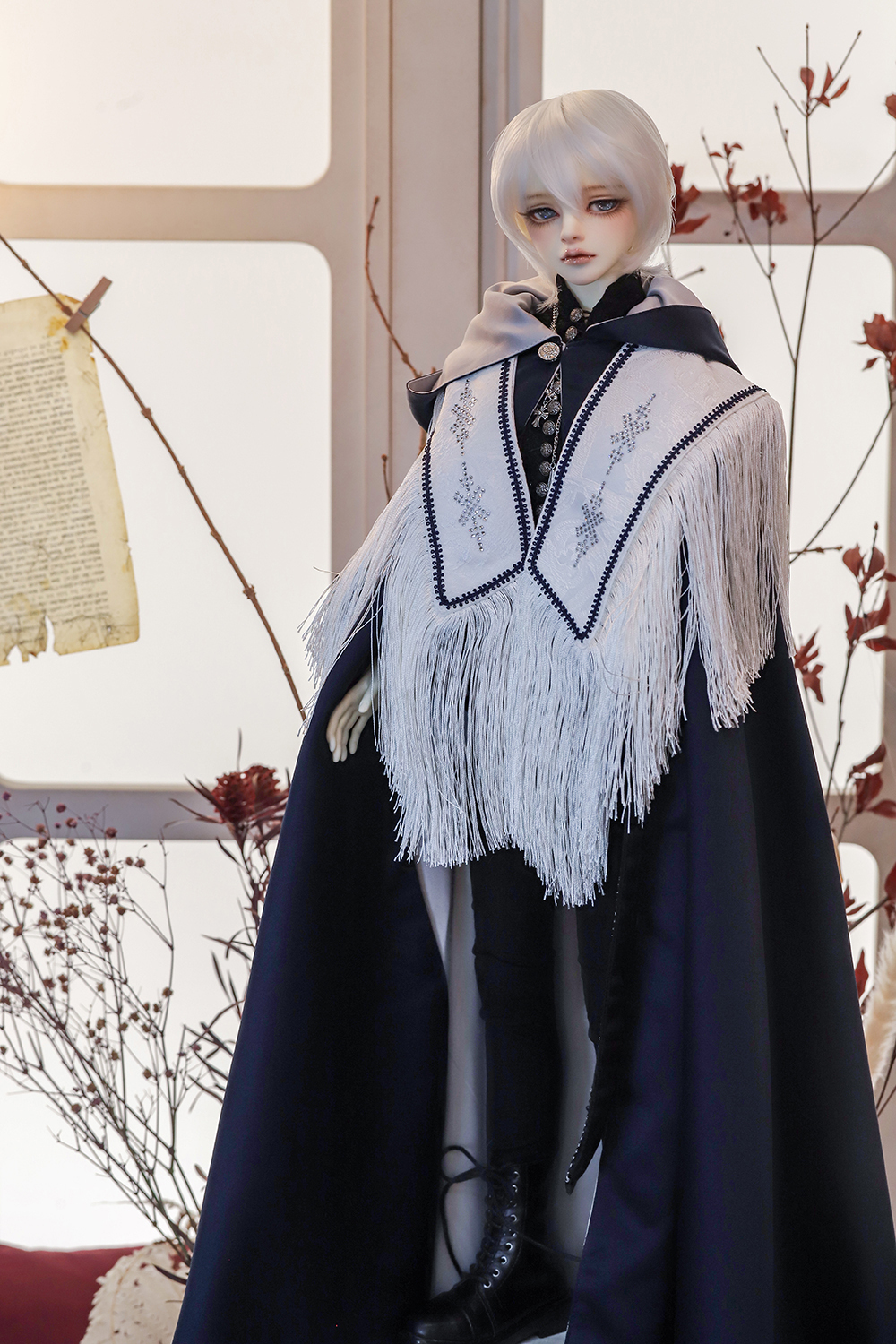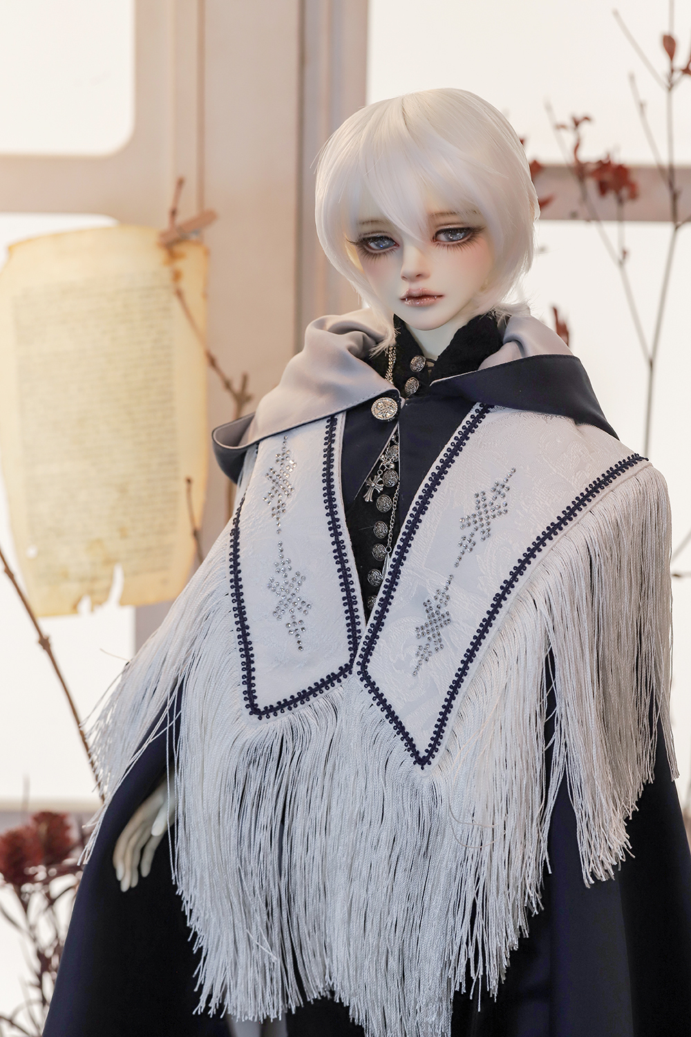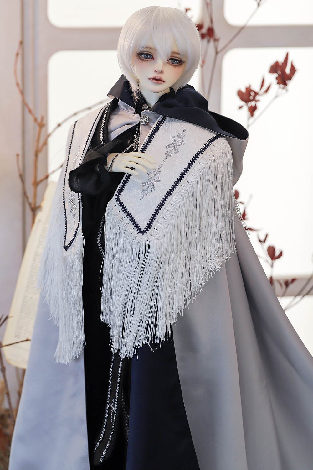 The elegant shirt with antique silver buttons, the sparkling crystal cross strap, and the swaying fringed shoulder cape give off the mysterious wizard's look. The reversible cape has both a dignified silver and a mysterious navy blue, allowing you to enjoy the transitional atmosphere on both sides.