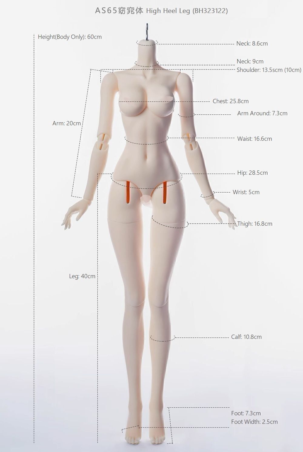 | 60cm Girl High Heel Leg & 普胸: BH320010 | 62.8 | 22 | 8.3 | 12.5 | 24.5 | 17.6 | 26 | 18.5 | 4.9 | 38 | 16 | 6.8 | 2.8 | 8~9 | 16 | |