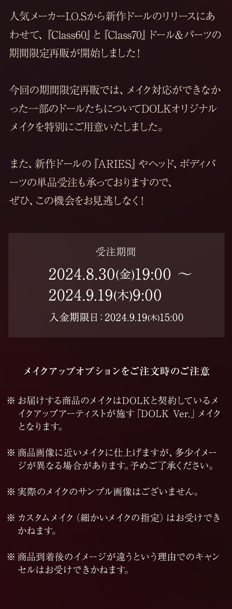 今回の期間限定再販では、メイク対応ができなかった一部のドールたちについて DOLKオリジナルメイクを特別にご用意いたしました。 また、新作ドールの『ARIES』やヘッド、ボディパーツの単品受注も承っておりますので、 ぜひ、この機会をお見逃しなく!
