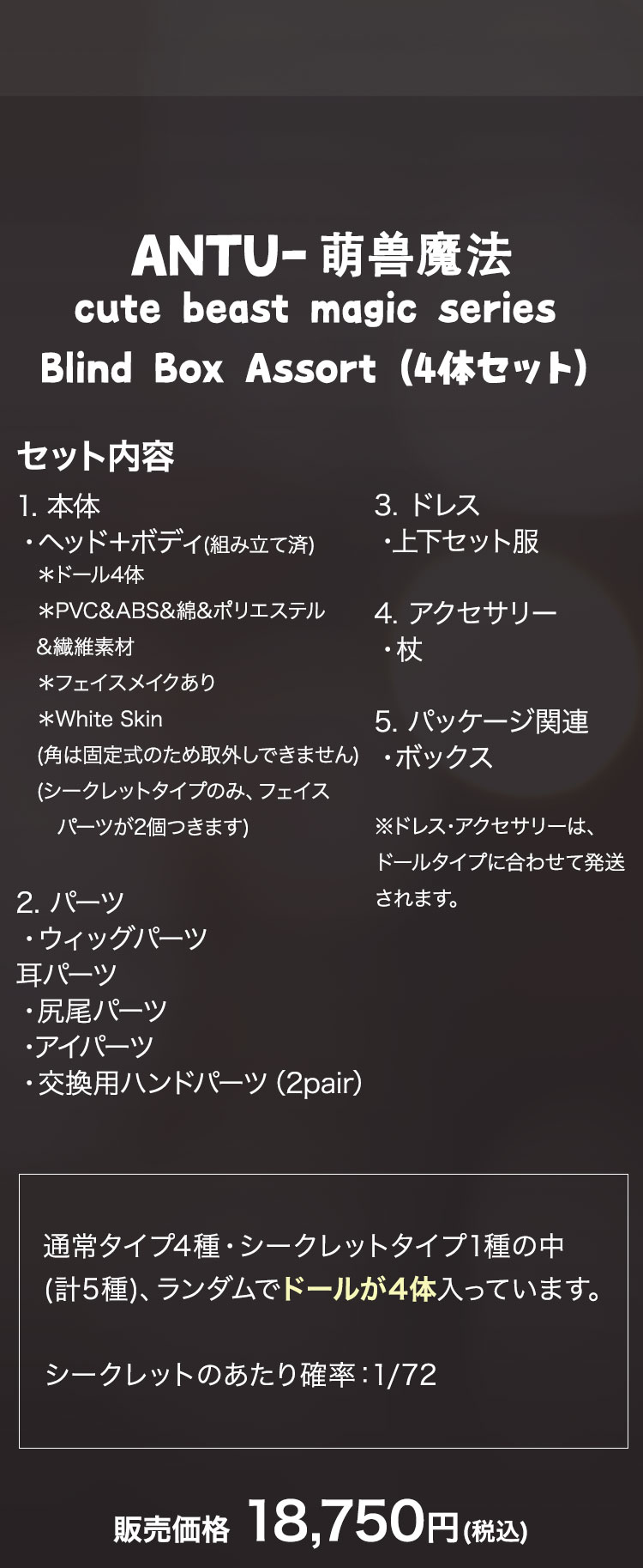 リリース以来大人気のブラインドボックスシリーズ『ANTU』が、今度は魔法少女になって登場! パワーアップした可愛さもさることながら、低価格帯とは思えないクオリティの高さにもご注目ください。 キュートなケモ耳パーツはマグネットでの取り外しが可能で、 今作のドールたちと自由に付け替えをしてお楽しみいただけます♪ 宝石の杖を掲げる可憐な『ANTU』たちを、ぜひご覧ください。