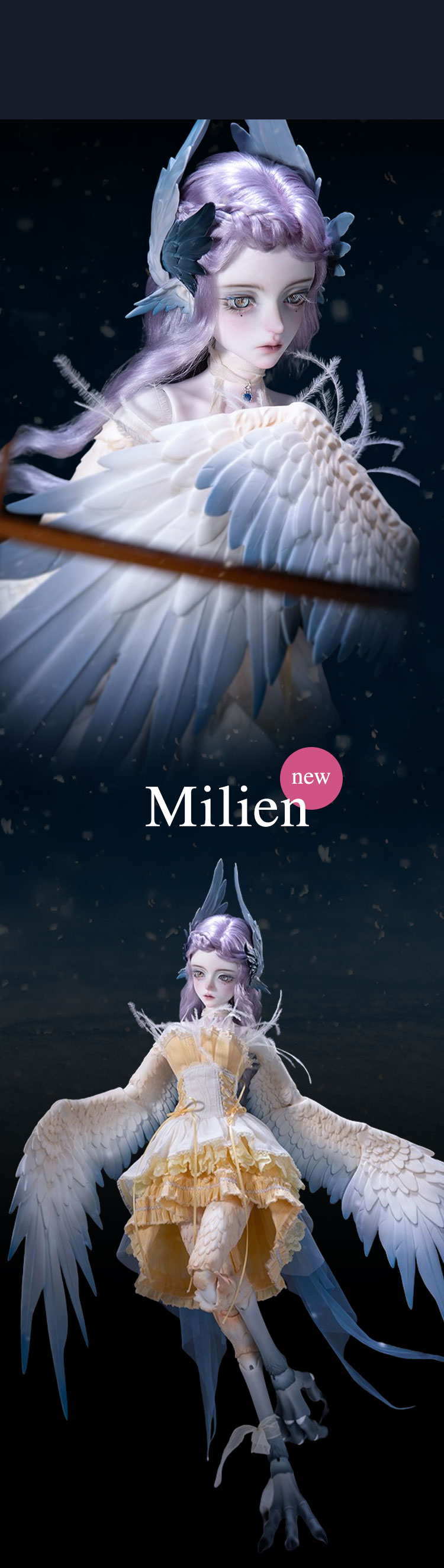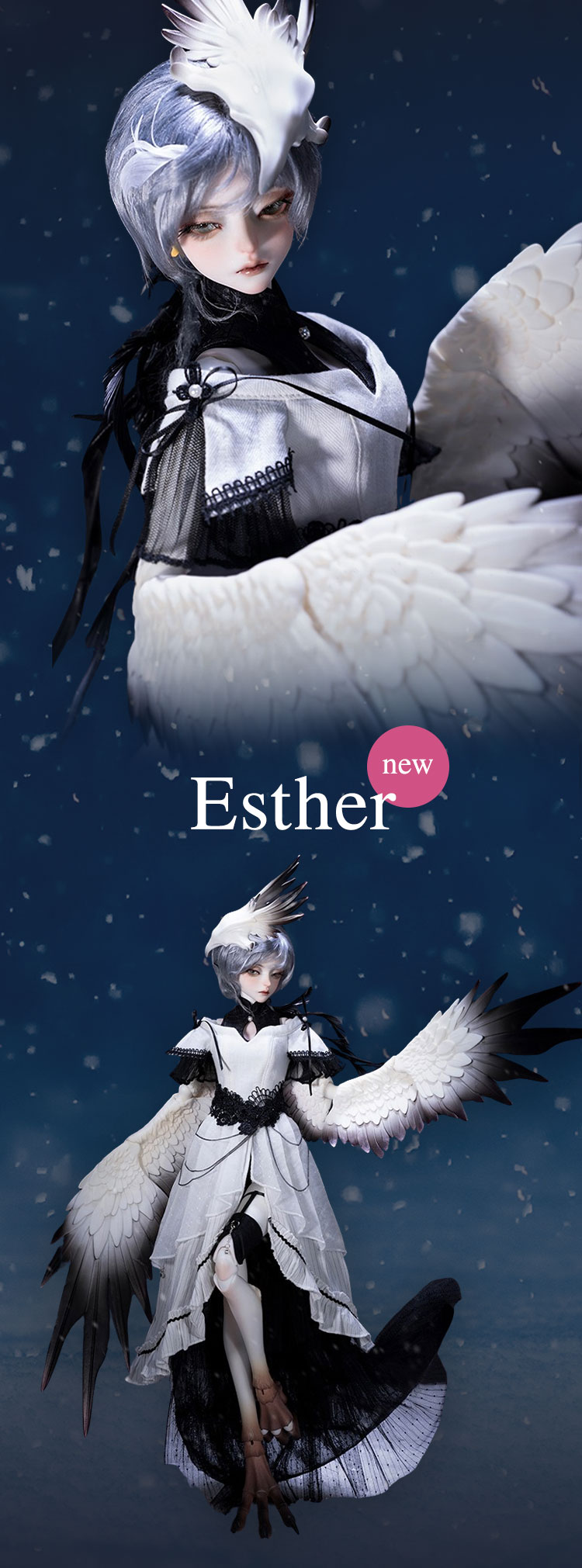 春節の訪れとともに優雅な双翼を携えた40cmクラスドールが舞い降りました。 洗練された翼のデザインで名高いメーカー独自のハーピィ型ボディを採用し、 落ち着いたモノトーン調の『Esther』と温かみを感じさせる『Milien』の 美しい双子ドールが誕生しています。 今ならリリース記念キャンペーンとして20%OFF でのお迎えが可能となっております♪ お得なキャンペーンの受付は2月24日(月)まで。 どうぞお見逃しなく!