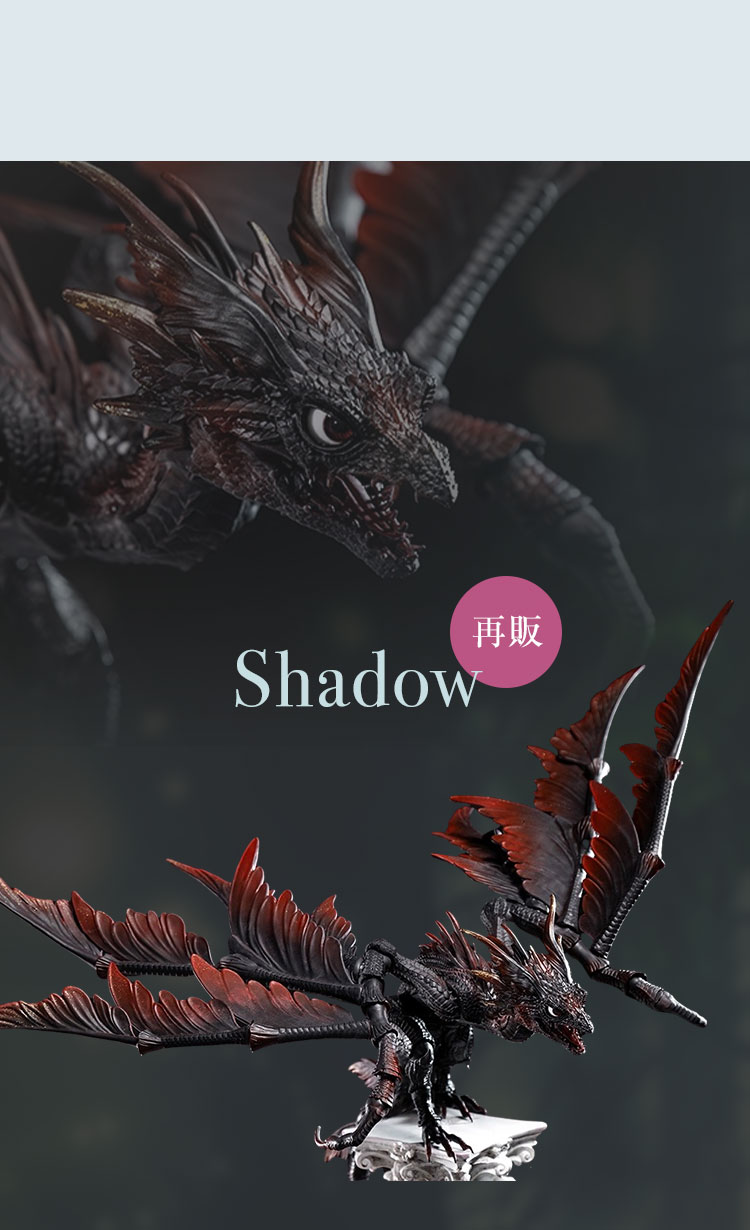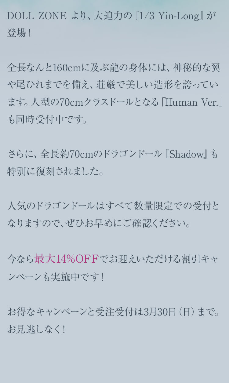 全長なんと160cmに及ぶ龍の身体は、これまで同様に神秘的な翼や尾ひれまでを備え、荘厳で美しい造形を誇ります。人型の70cmクラスドールとなる「Human Ver.」も同時に受付中です。 さらに、全長約70cmのドラゴンドール『Shadow』も特別に復刻されました。 人気のドラゴンドールはすべて数量限定での受付となりますので、ぜひお早めにご確認ください。 今なら最大14%OFFでお迎えいただける割引キャンペーンも実施中です! お得なキャンペーンと受注受付は3月30日(日)まで。お見逃しなく!