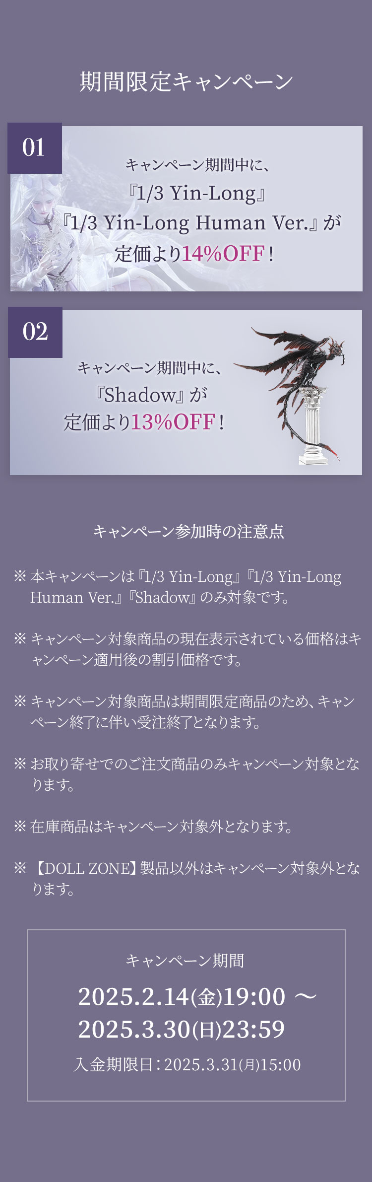 キャンペーン期間中に、 ①『1/3 Yin-Long』『1/3 Yin-Long Human Ver.』が定価より【14%OFF】! ②『Shadow』が定価より【13%OFF】!