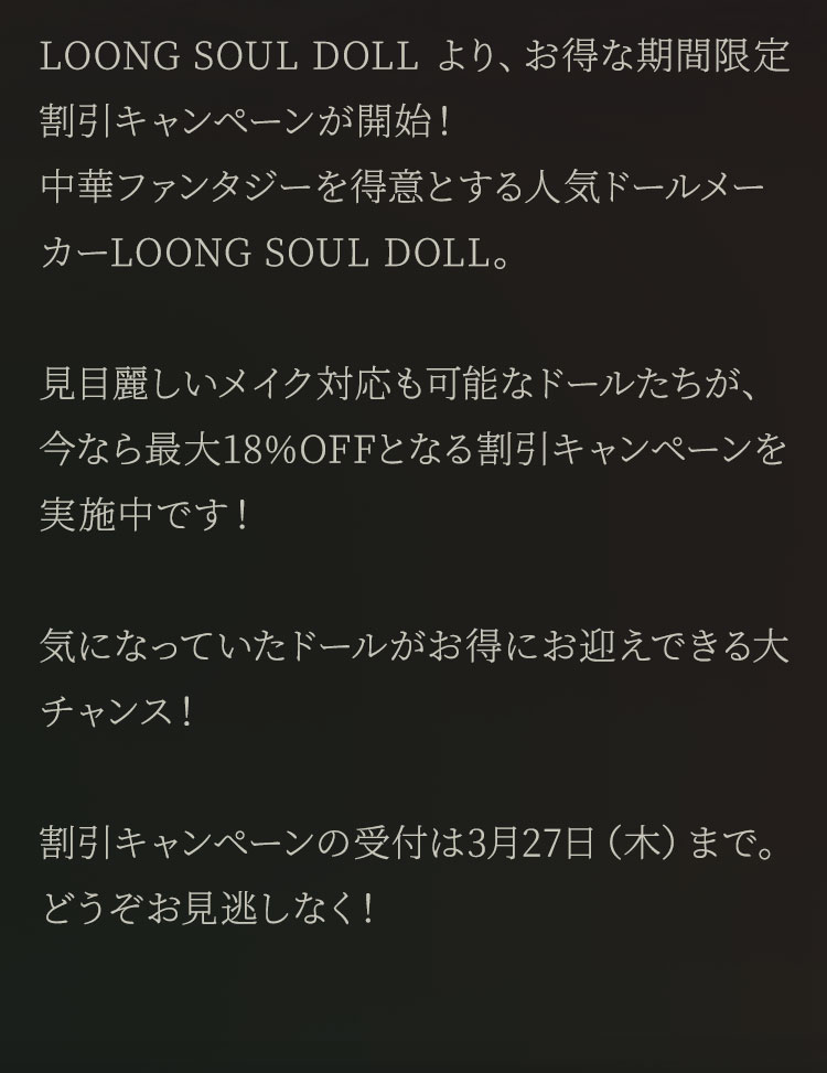 LOONG SOUL DOLL より、お得な期間限定割引キャンペーンが開始!
