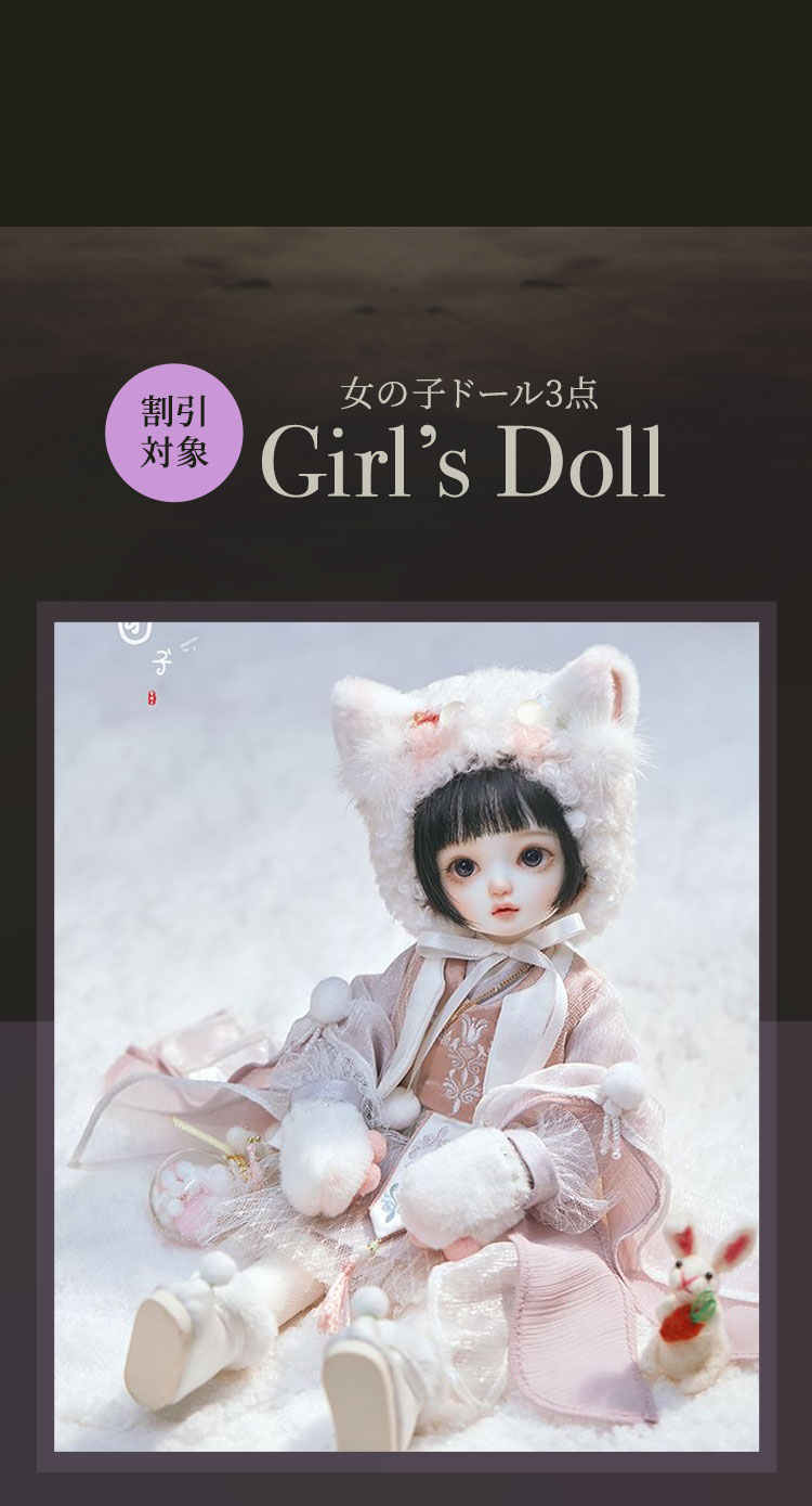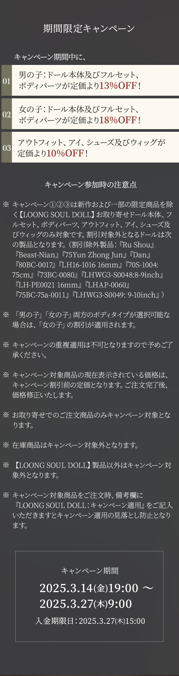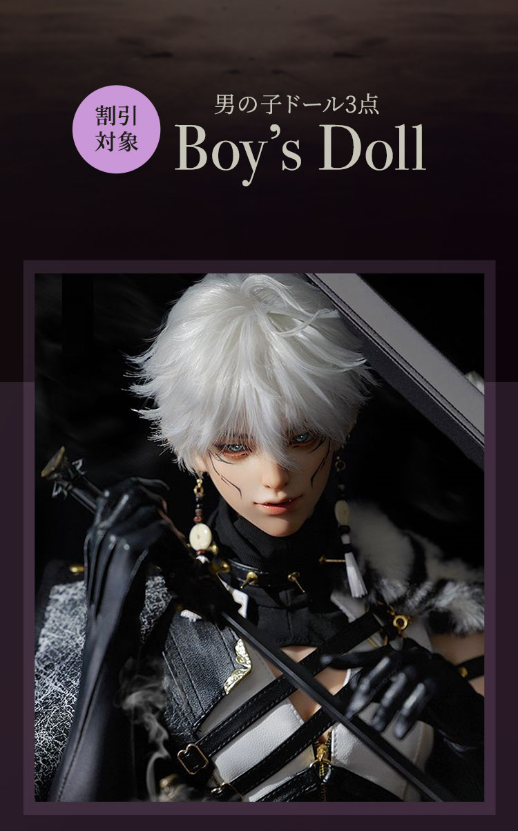 キャンペーン期間中に、 ①男の子:ドール本体及びフルセット、ボディパーツが定価より【13%OFF】! ②女の子:ドール本体及びフルセット、ボディパーツが定価より【18%OFF】! ③アウトフィット、アイ、シューズ及びウィッグが定価より【10%OFF】!