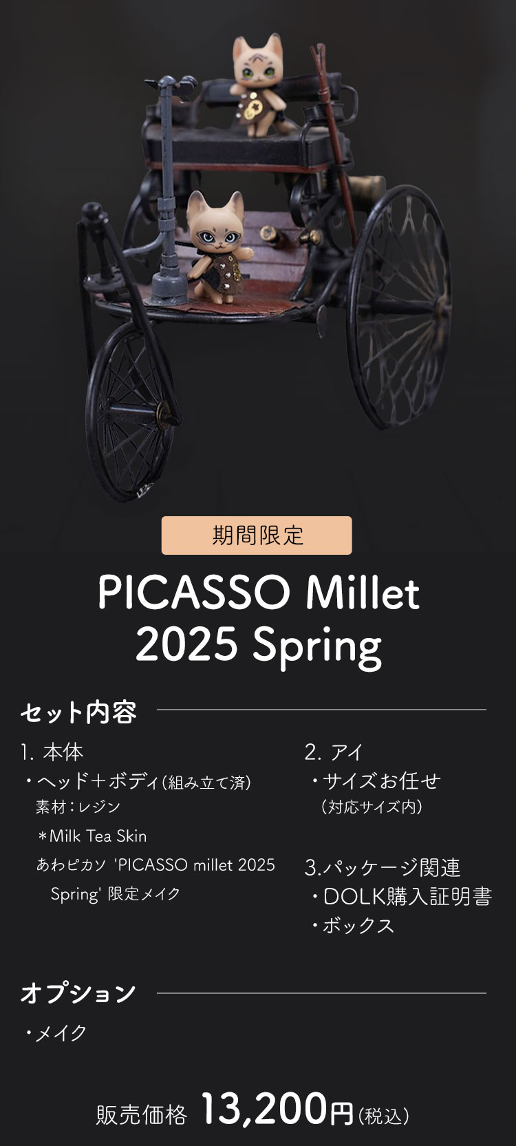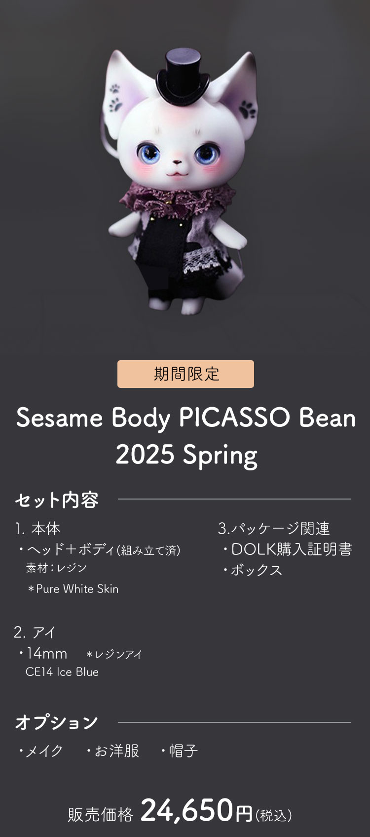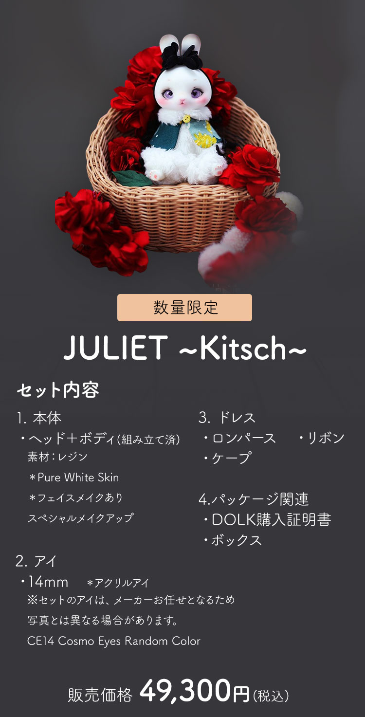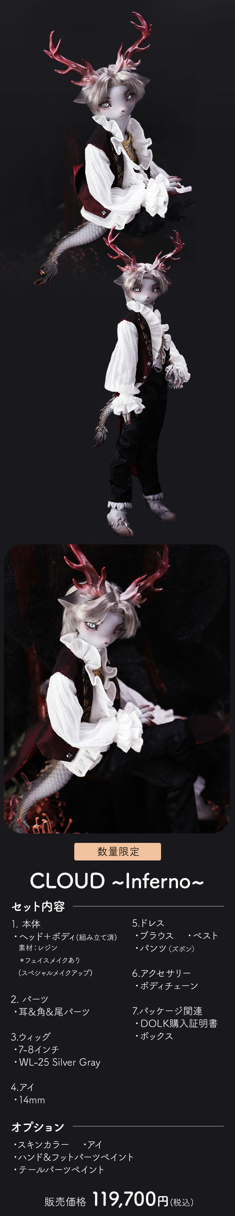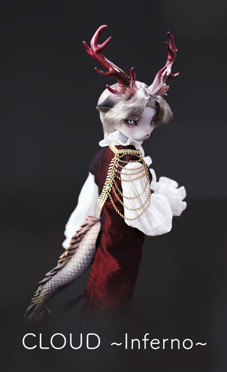貴族のような衣装を纏う40cmクラスドール『CLOUD ~Inferno~』。 炎を思わせる紅のパーツメイクや、気品漂うスペシャルフェイスメイクにご注目ください。 ふっくら造形が可愛い10cmクラスアニマルドール『JULIET ~kitsch~』も新登場! キュートなウサ耳は見ているだけで癒されます♪ メイク、お洋服を含む数量限定フルセットでの受付となります。 また、ミルクティースキンとホワイトスキンのPICASSOたちも、この春だけの期間限定メイクver.が登場しています。 手のひらサイズのプチドールたちも、ぜひご覧ください。 期間限定ドールの受付は5月7日(水)まで。 癒しのアニマルドール最新作をお見逃しなく!