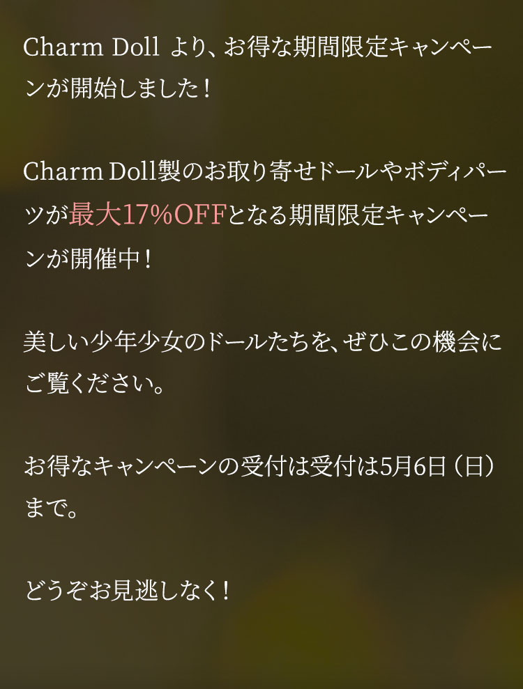 Charm Doll製のお取り寄せドールやボディパーツが 最大17%OFF となる期間限定キャンペーンが開催中! 美しい少年少女のドールたちを、ぜひこの機会にご覧ください。 お得なキャンペーンの受付は受付は5月6日(日)まで。 どうぞお見逃しなく!