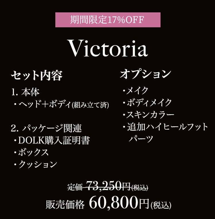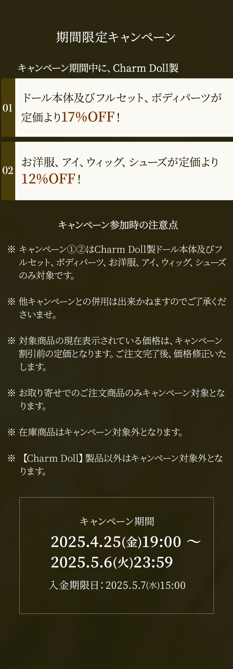 キャンペーン期間中に、Charm Doll製 ①ドール本体及びフルセット、ボディパーツが定価より【17%OFF】! ②お洋服、アイ、ウィッグ、シューズが定価より【12%OFF】!