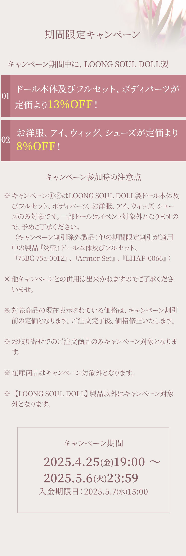 キャンペーン期間中に、 LOONG SOUL DOLL製 ①ドール本体及びフルセット、ボディパーツが定価より【13%OFF】! ②お洋服、アイ、ウィッグ、シューズが定価より【8%OFF】!