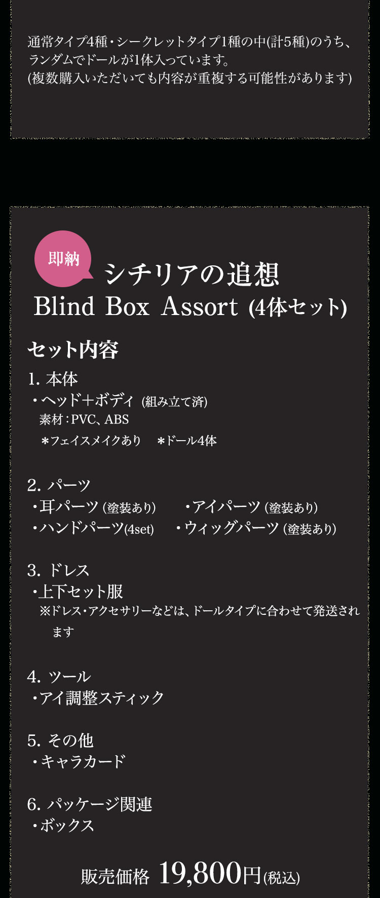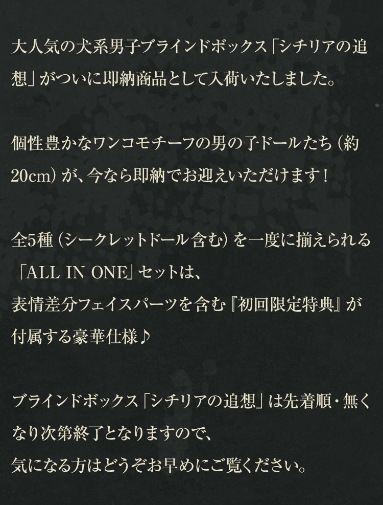 個性豊かなワンコモチーフの男の子ドールたち(約20cm)が、 今なら即納でお迎えいただけます! 全5種(シークレットドール含む)を一度に揃えられる「ALL IN ONE」セットは、 表情差分フェイスパーツを含む『初回限定特典』が付属する豪華仕様♪ ブラインドボックス「シチリアの追想」は先着順・無くなり次第終了となりますので、 気になる方はどうぞお早めにご覧ください。