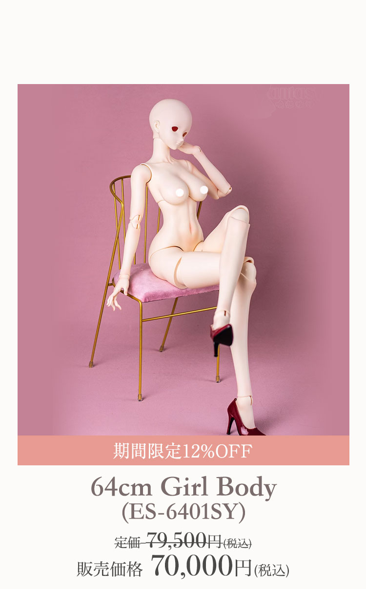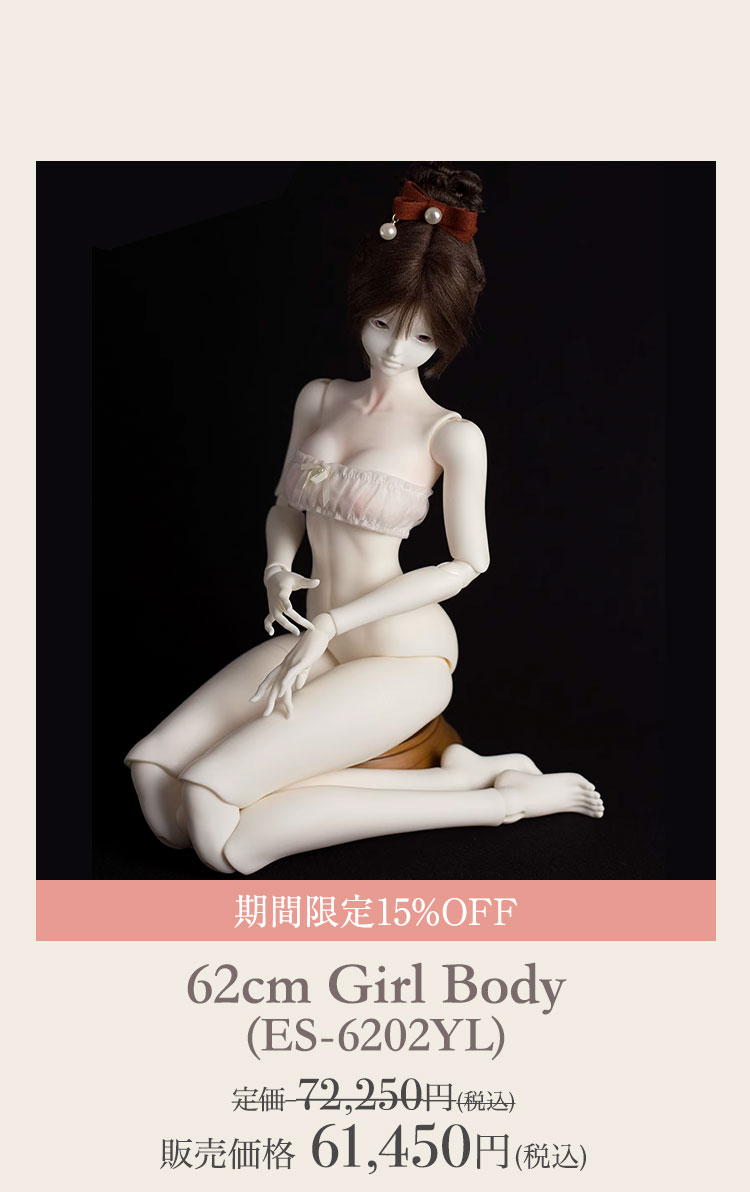 キャンペーン期間中に、 ①新作ドール『湘桃』、『62cm Girl Body (ES-6202YL)』が定価より【15%OFF】! ②『蓝雾』、『时迷』、『绯紫』、『时迷 Head』、『45cm Girl Body (ES-4502SY)』、『60cm Girl Body (ES-6001SY)』、『61cm Boy Body (ES-6102SY)』、『64cm Girl Body (ES-6401SY)』、『1/4 Parts (松茸体)』、『1/4 Silicon Chest Parts (松茸体)』、『1/3 Hand Parts』 が定価より【12%OFF】!