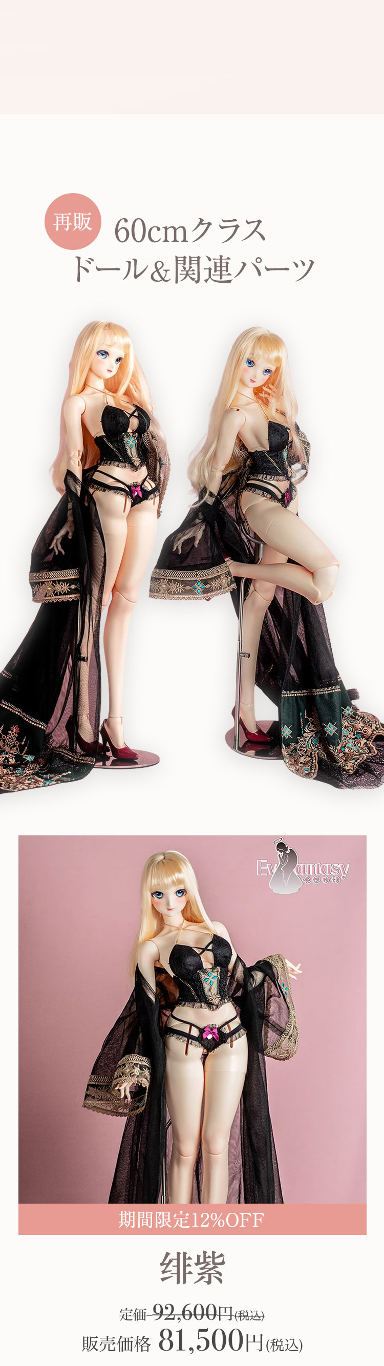 柔らかなシリコン製バストパーツを採用した新時代のドールを世に送り出している『Evantasy』。 新作ドール『湘桃』リリースに伴い、これまでのドール・パーツ類が一挙再販開始となりました! 今回の再販では、なんと最大 15%OFF となる割引キャンペーンも同時開催中です♪ お得な受注&割引キャンペーンの受付は6月29日(日)まで。 新たな可能性を秘めたドールたちを、ぜひご覧ください!