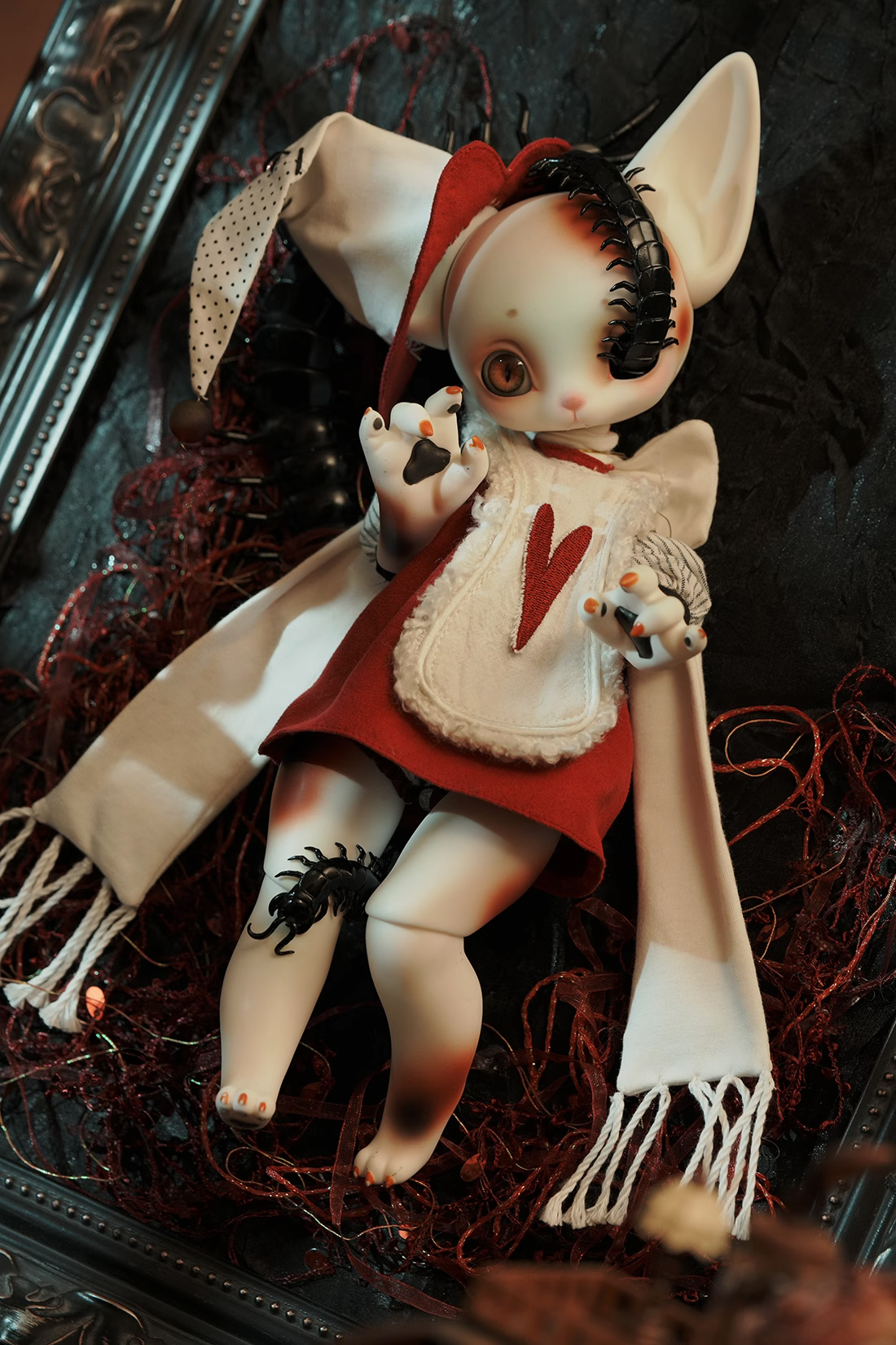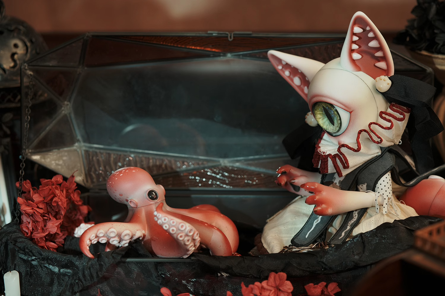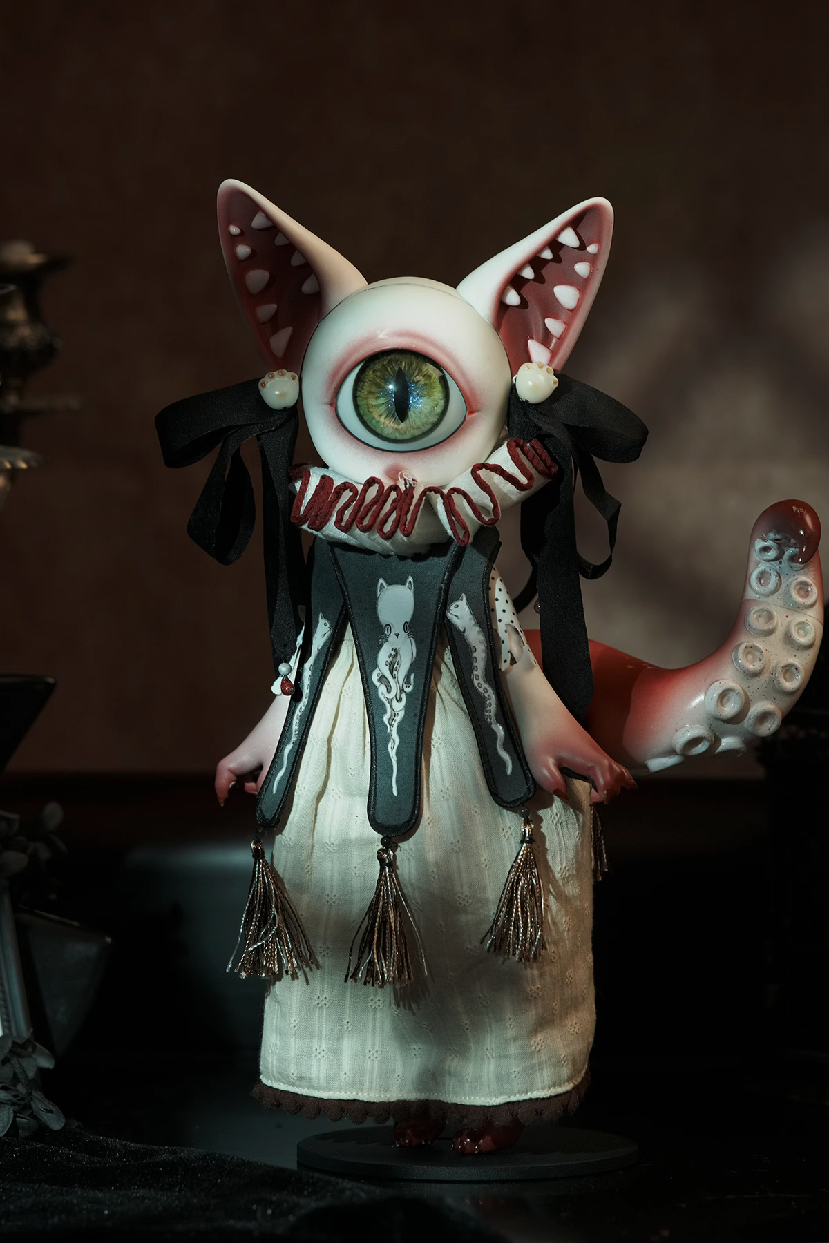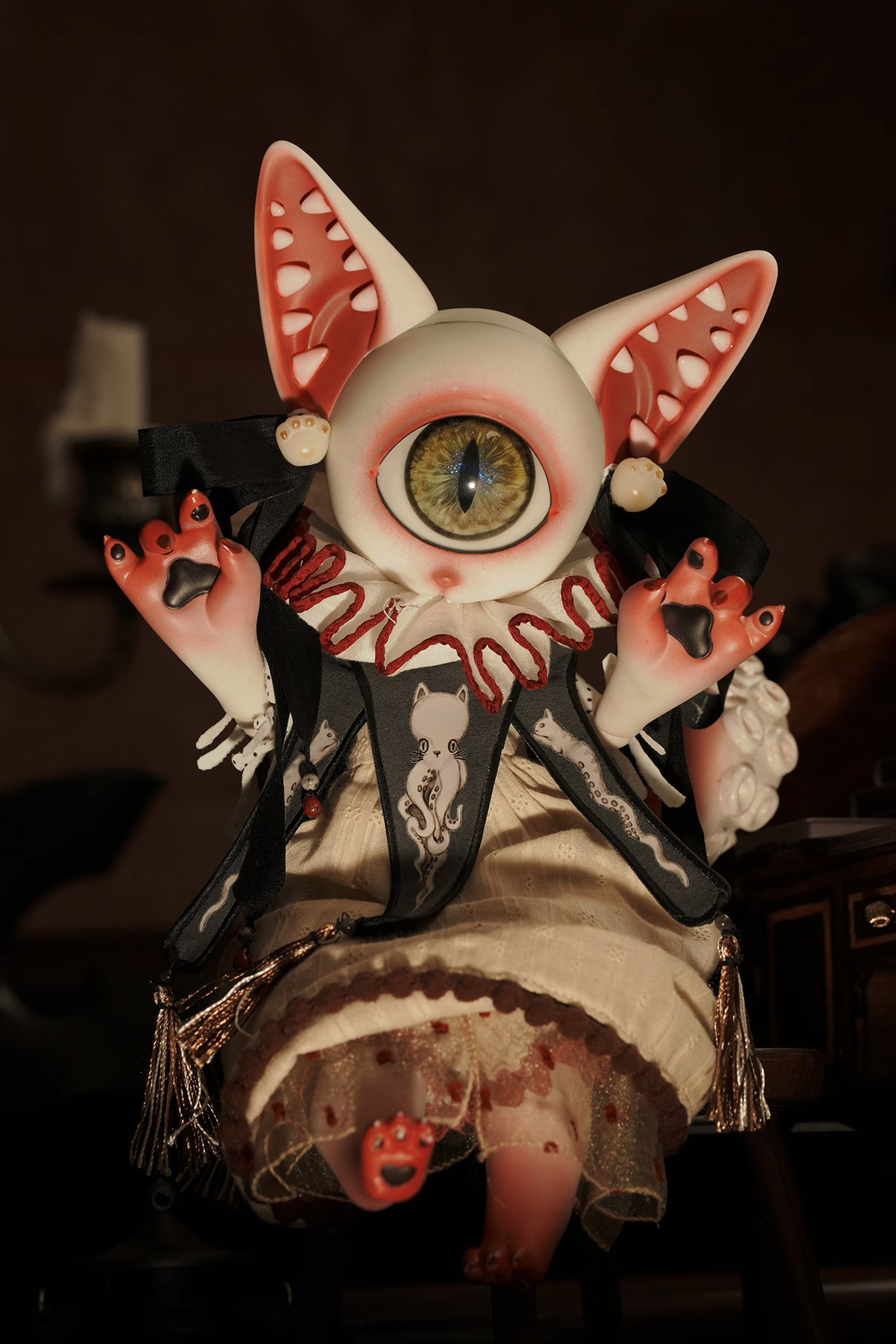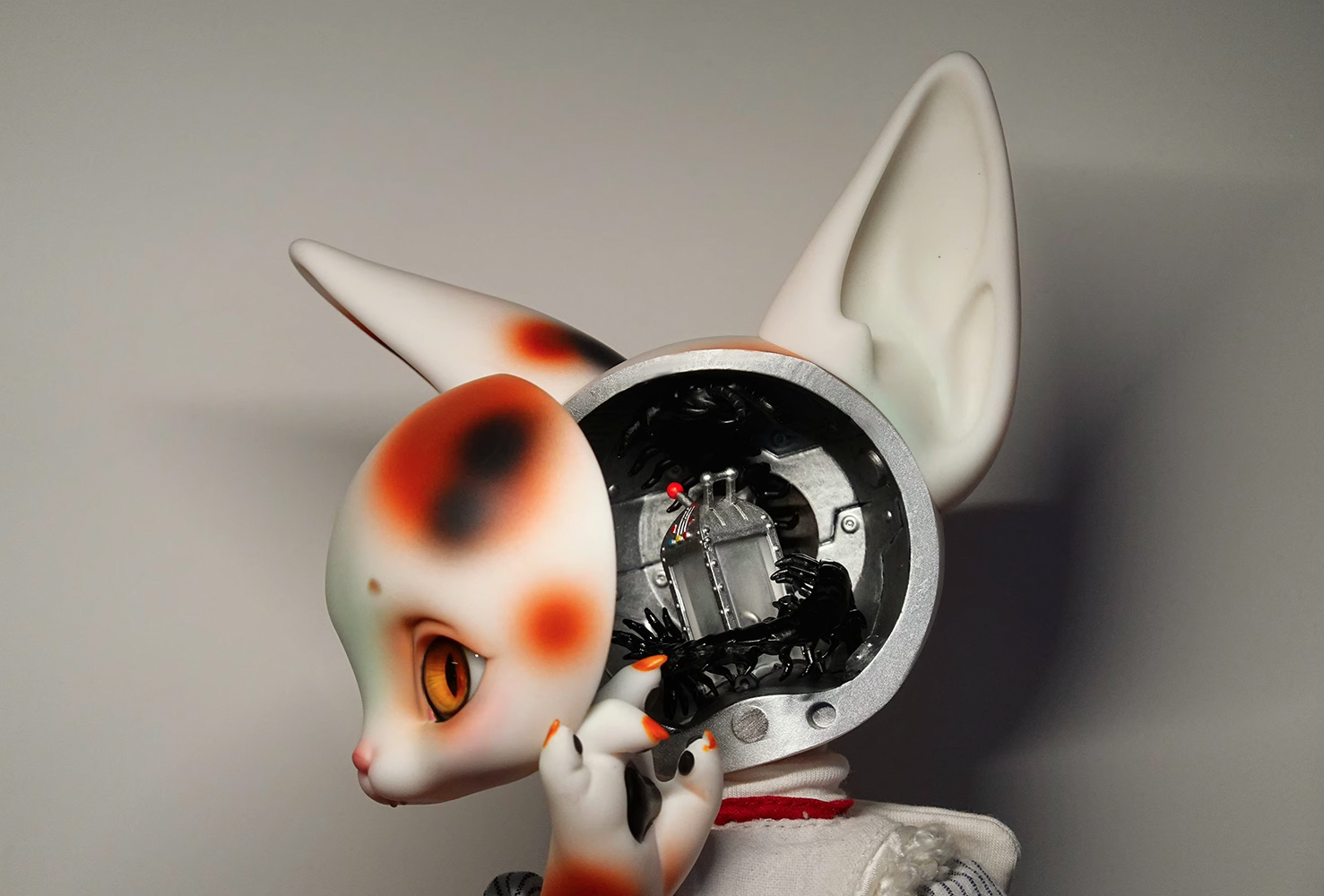 「かわいい」と「ちょっと不気味」の絶妙バランス。 愛らしい猫フォルムを残しつつ、 異形のエッセンスがふんだんに盛り込まれた身長28cmのアニマルドール。 開閉可能なヘッドパーツは内部まで造形が作り込まれ、コックピットのような仕上がりに。 一度見たら忘れられない、唯一無二のアニマルドールたちをぜひお迎えください。 専用のお洋服セット単品は数量ごく僅かでの受付となります。 受注受付は6月19日(木)朝9時まで。 どうぞお見逃しなく!