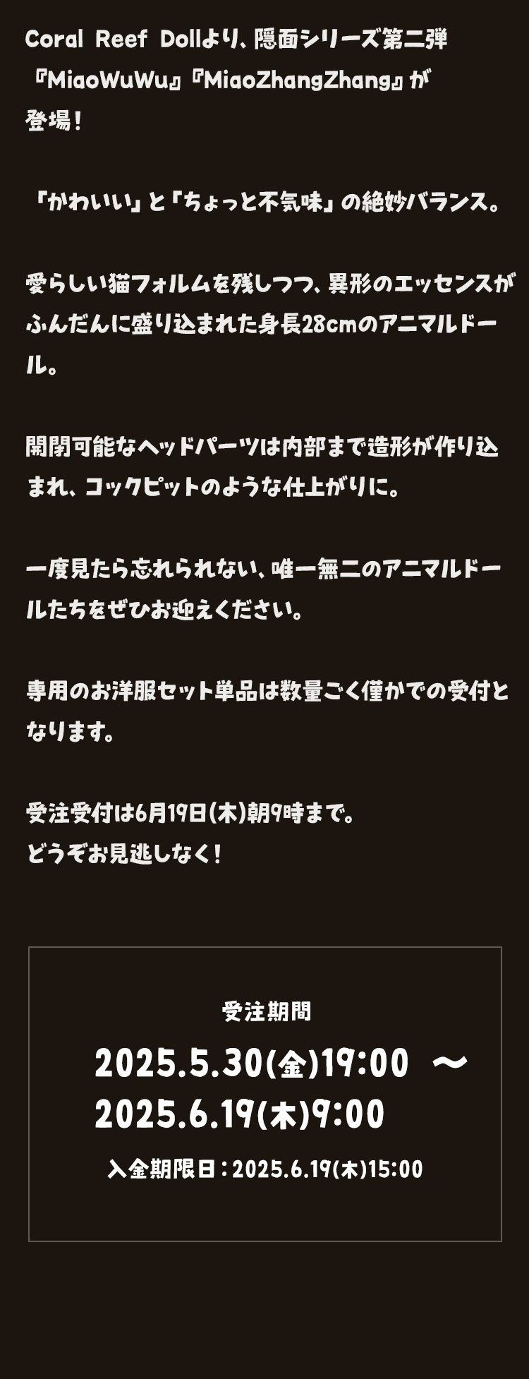 Coral Reef Dollより、隠面シリーズ第二弾『MiaoWuWu』『MiaoZhangZhang』が登場!