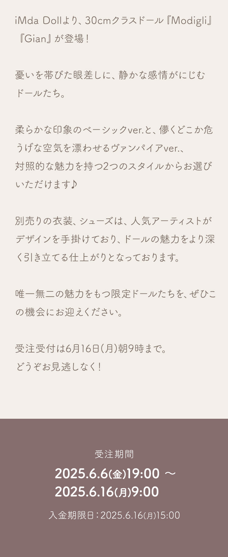 憂いを帯びた眼差しに、静かな感情がにじむドールたち。 柔らかな印象のベーシックver.と、儚くどこか危うげな空気を漂わせるヴァンパイアver.、対照的な魅力を持つ2スタイルからお選びいただけます♪ 別売りの衣装、シューズは、人気アーティストがデザインを手掛けており、 ドールの魅力をより深く引き立てる仕上がりとなっております。 唯一無二の魅力をもつ限定ドールたちを、ぜひこの機会にお迎えください。 受注受付は6月16日(月)朝9時まで。 どうぞお見逃しなく!