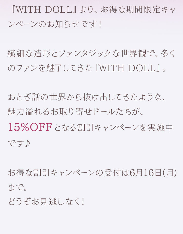 繊細な造形とファンタジックな世界観で、多くのファンを魅了してきた『WITH DOLL』。 おとぎ話の世界から抜け出してきたような、魅力溢れるお取り寄せドールたちが、 15%OFF となる割引キャンペーンを実施中です♪ お得な割引キャンペーンの受付は6月16日(月)まで。 どうぞお見逃しなく!