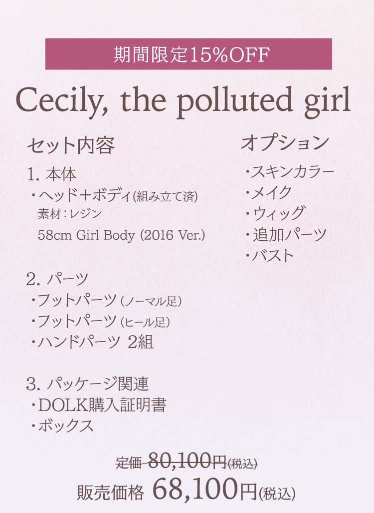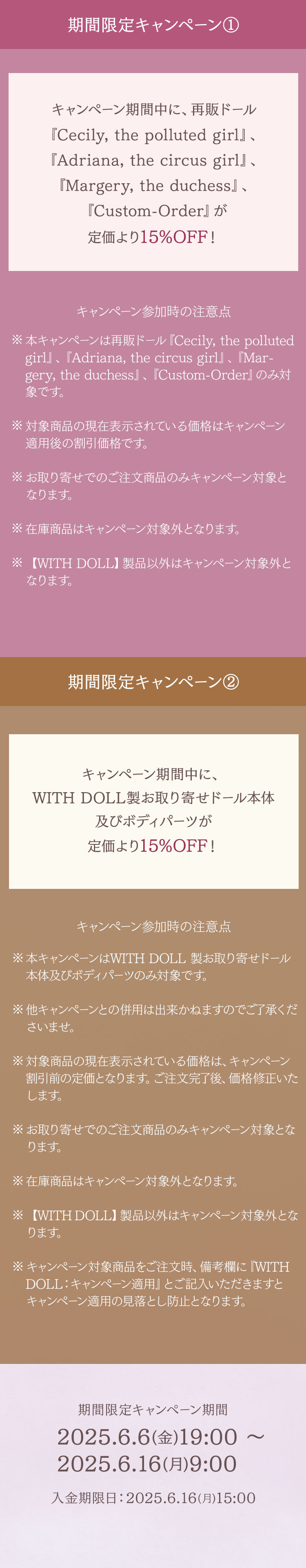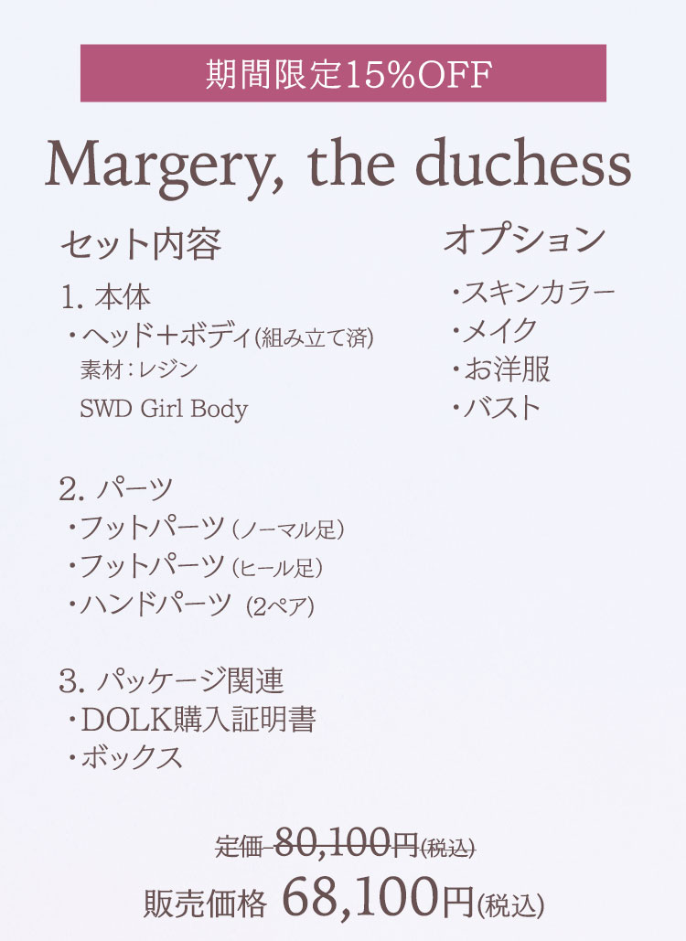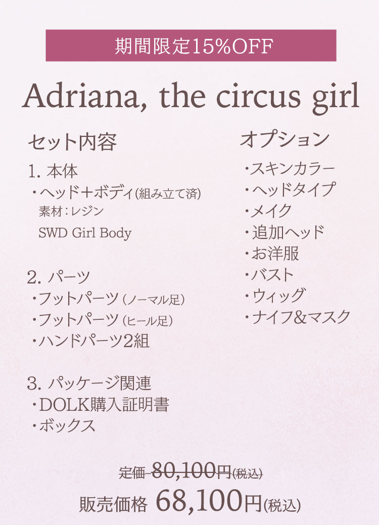 期間限定キャンペーン①:キャンペーン期間中に、 再販ドール『Custom-Order』、『Cecily, the polluted girl』、 『Adriana, the circus girl』、『Margery, the duchess』が 定価より【15%OFF】!