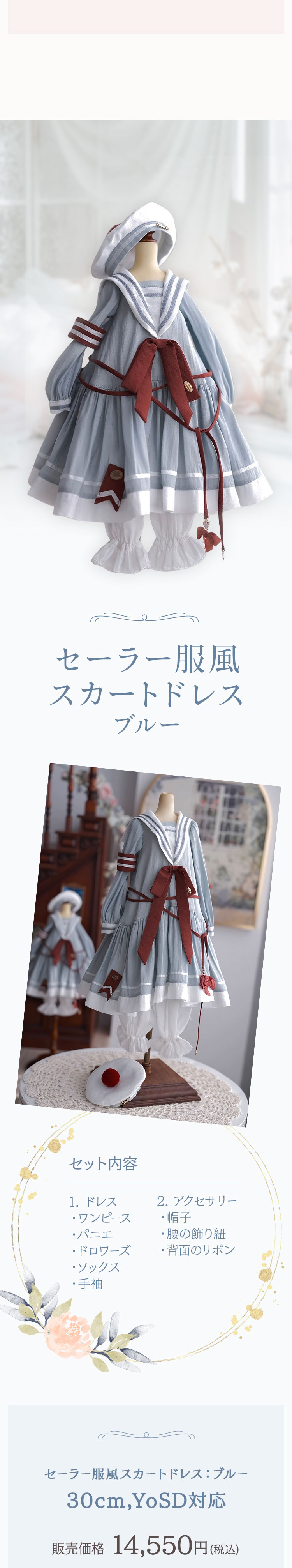 洗練されたデザインのなかにピュアで可憐な魅力を宿した「セーラードレス」と、 腰回りや背面のリボン装飾が印象的な「セーラー服風スカートドレス」の2種をご用意。 いずれも細部にまで丁寧な仕立てが施されており、写真映えも抜群の一着です。 清らかなホワイトと、落ち着いた知性が薫るブルー。 2色のカラーバリエーションが、上品でどこかノスタルジックな雰囲気を演出します。 まるで童話の世界から抜け出してきたかのような愛らしさを纏うドレスたちは、 この度、受注販売としてお届けいたします。 貴重なこの機会を、どうぞお見逃しなく。
