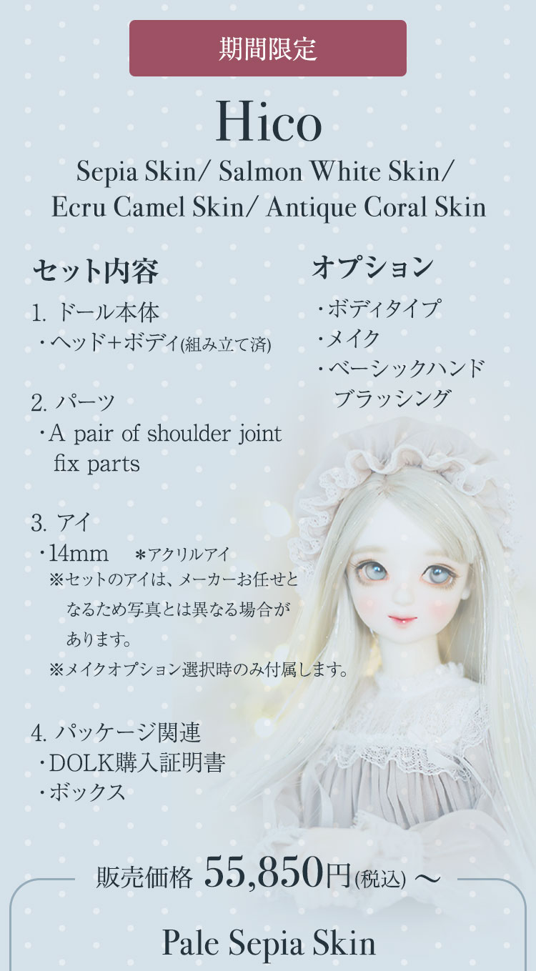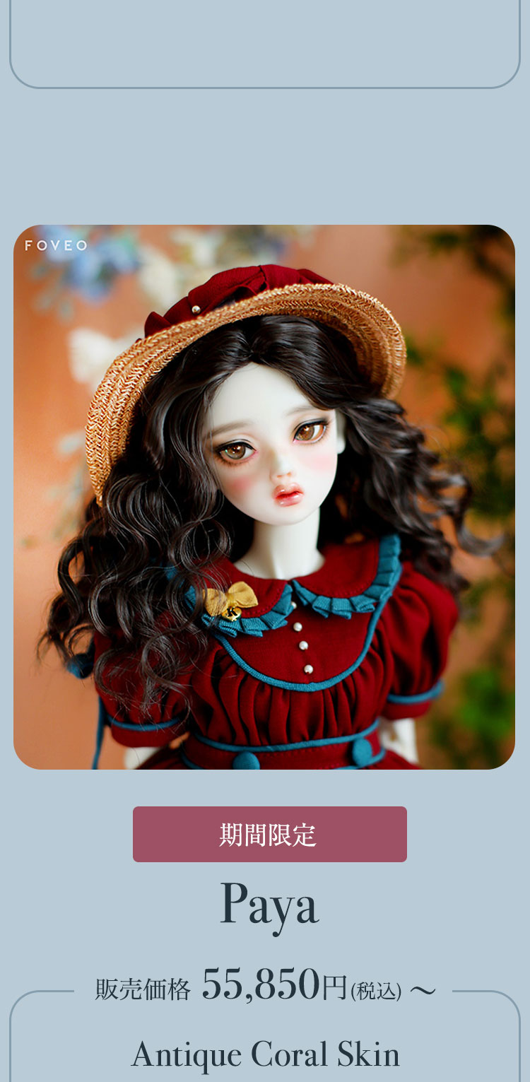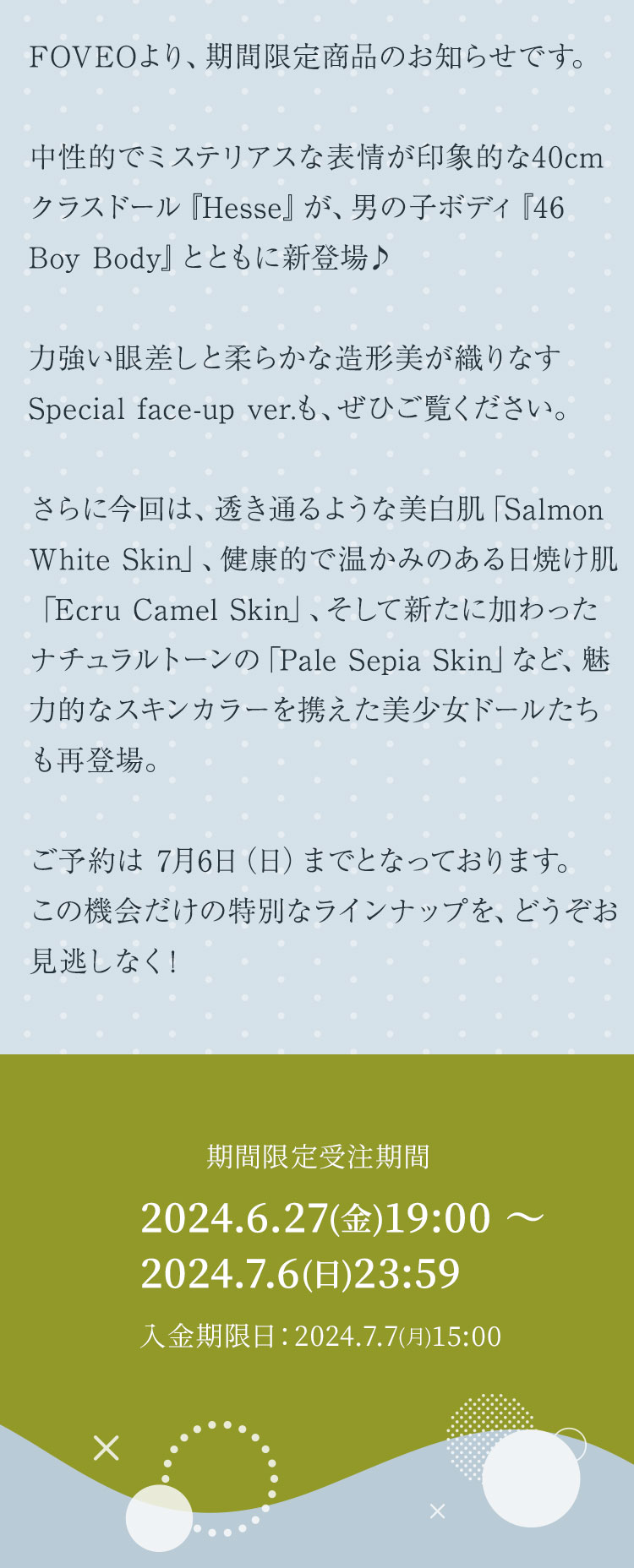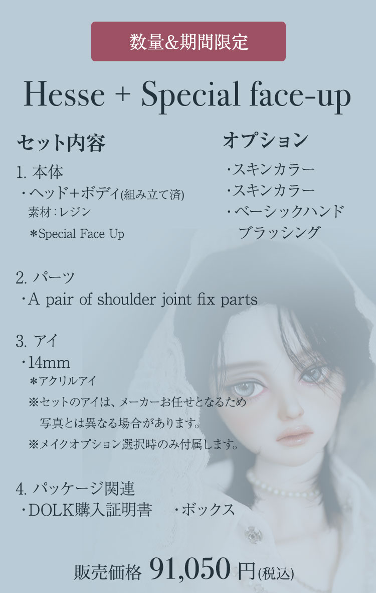 FOVEOより、期間限定商品のお知らせです。 中性的でミステリアスな表情が印象的なドール『HESSE』が、Special face-up ver.として登場♪ 力強い眼差しと柔らかな造形美が織りなす、唯一無二のドールをぜひご堪能ください。 さらに今回は、透き通るような美白肌「Salmon White Skin」、健康的で温かみのある日焼け肌「Ecru Camel Skin」、そして新たに加わったナチュラルトーンの「Pale Sepia Skin」など、魅力的なスキンカラーを携えた美少女ドールたちも再登場。 ご予約は 7月6日(日)までとなっております。 この機会だけの特別なラインナップを、どうぞお見逃しなく!