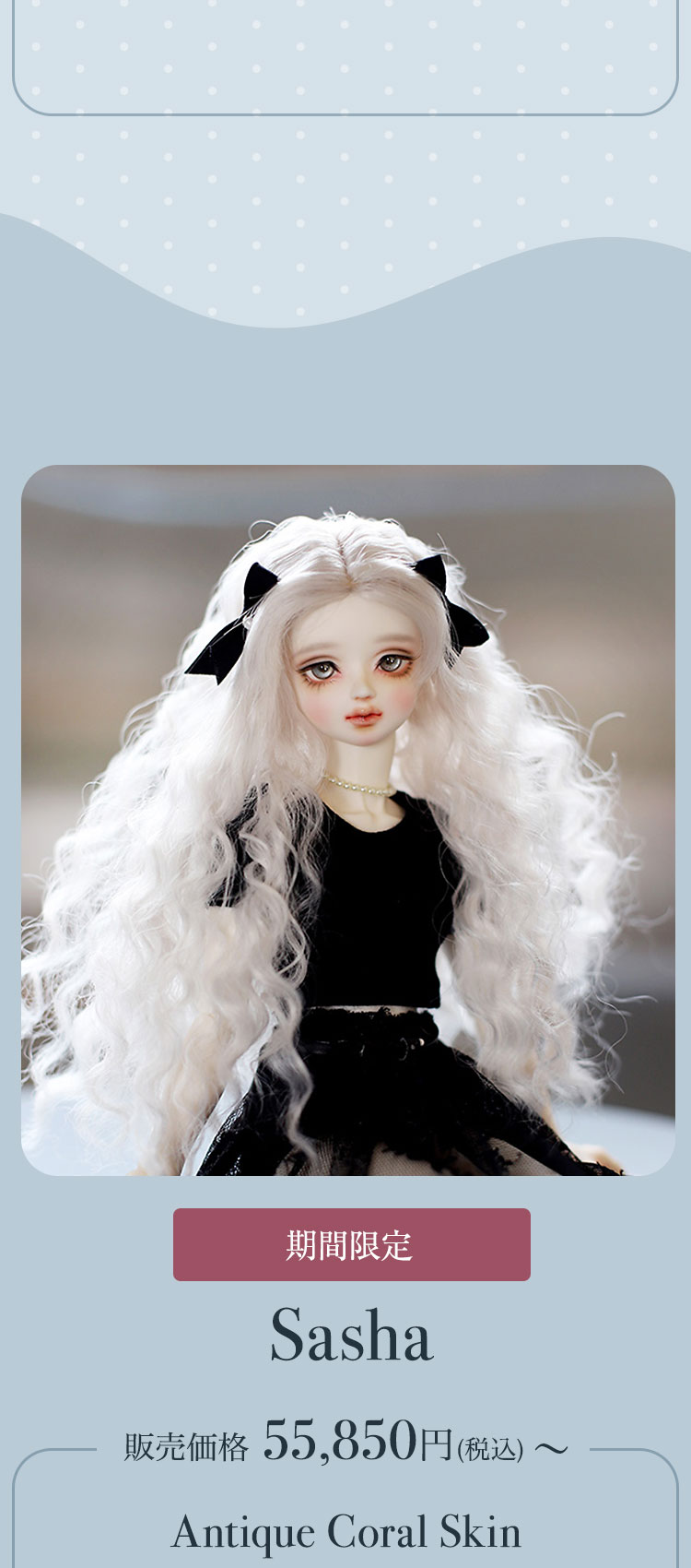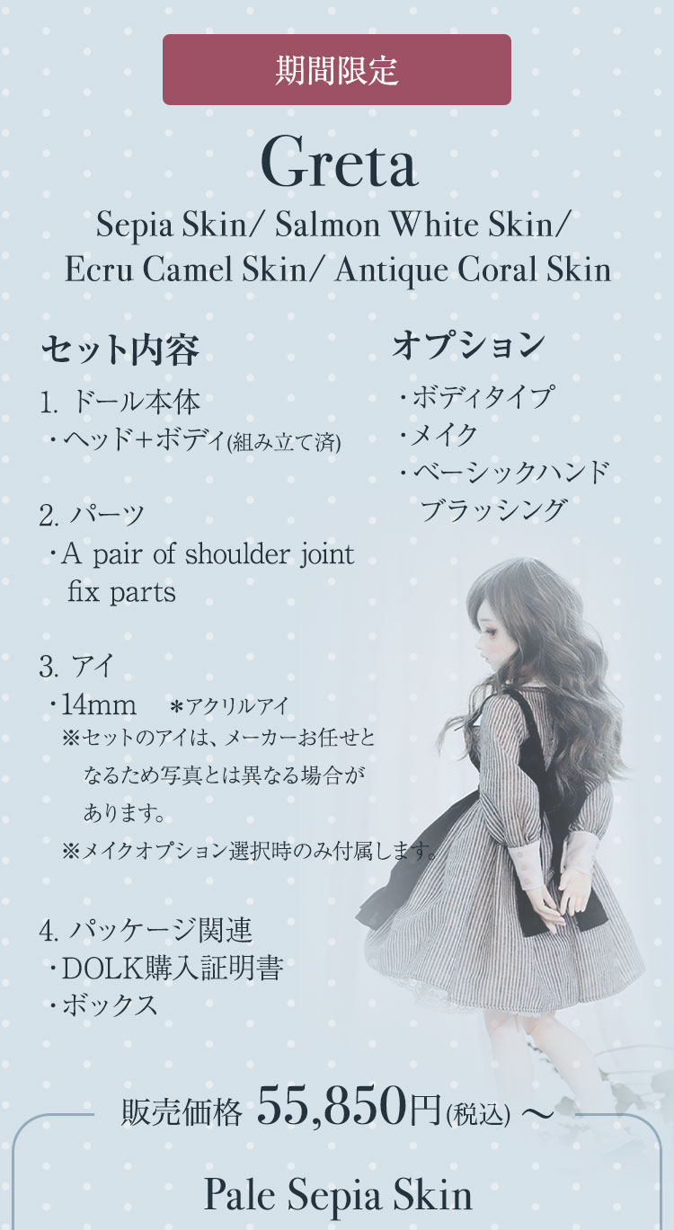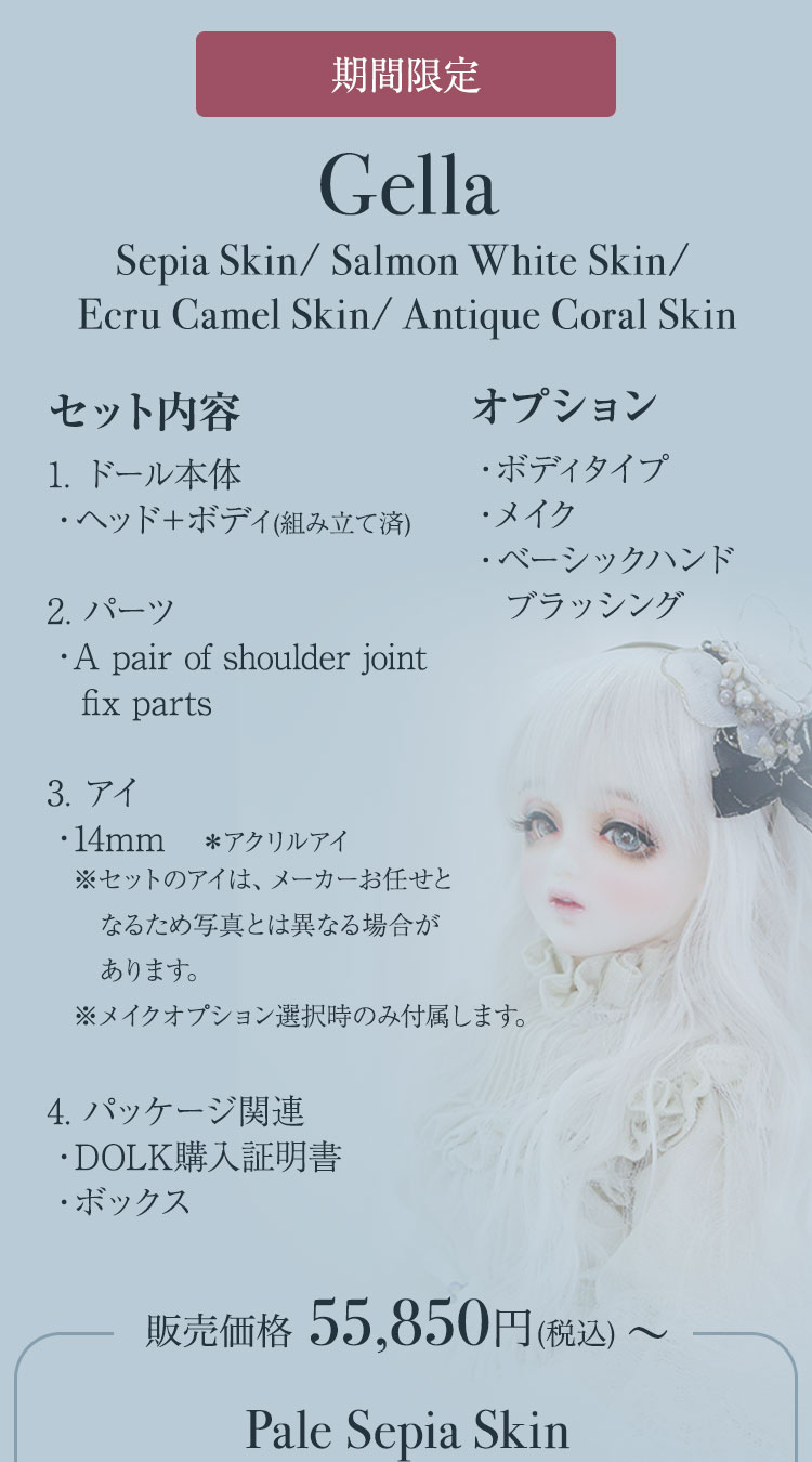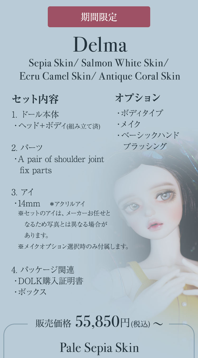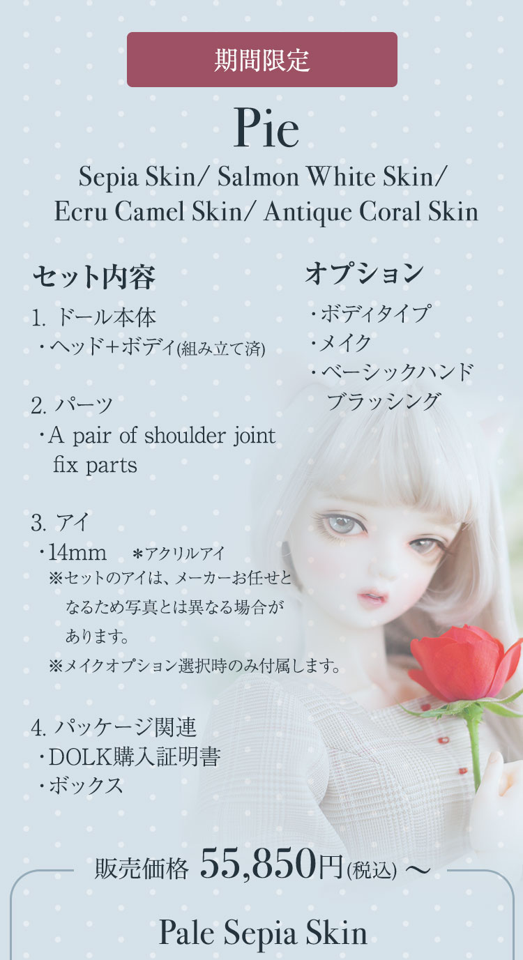 FOVEOより、期間限定商品のお知らせです。 中性的でミステリアスな表情が印象的なドール『HESSE』が、Special face-up ver.として登場♪ 力強い眼差しと柔らかな造形美が織りなす、唯一無二のドールをぜひご堪能ください。 さらに今回は、透き通るような美白肌「Salmon White Skin」、健康的で温かみのある日焼け肌「Ecru Camel Skin」、そして新たに加わったナチュラルトーンの「Pale Sepia Skin」など、魅力的なスキンカラーを携えた美少女ドールたちも再登場。 ご予約は 7月6日(日)までとなっております。 この機会だけの特別なラインナップを、どうぞお見逃しなく!