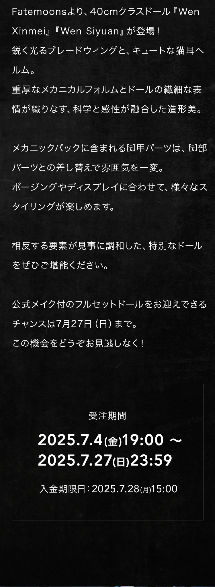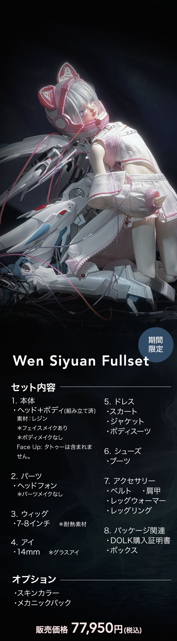 鋭く光るブレードウィングと、キュートな猫耳ヘルム。 重厚なメカニカルフォルムとドールの繊細な表情が織りなす、科学と感性が融合した造形美。 メカニックパックに含まれる脚甲パーツは、脚部パーツとの差し替えで雰囲気を一変。 ポージングやディスプレイに合わせて、様々なスタイリングが楽しめます。 相反する要素が見事に調和した、特別なドールをぜひご堪能ください。 公式メイク付のフルセットドールをお迎えできるチャンスは7月27日(日)まで。 この機会をどうぞお見逃しなく!