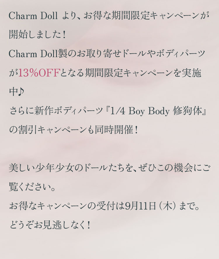 Charm Doll製のお取り寄せドールやボディパーツが 13%OFF となる期間限定キャンペーンを実施中♪ さらに新作ボディパーツ『1/4 Boy Body 修狗体』の割引キャンペーンも同時開催! 美しい少年少女のドールたちを、ぜひこの機会にご覧ください。 お得なキャンペーンの受付は9月11日(木)まで。 どうぞお見逃しなく!