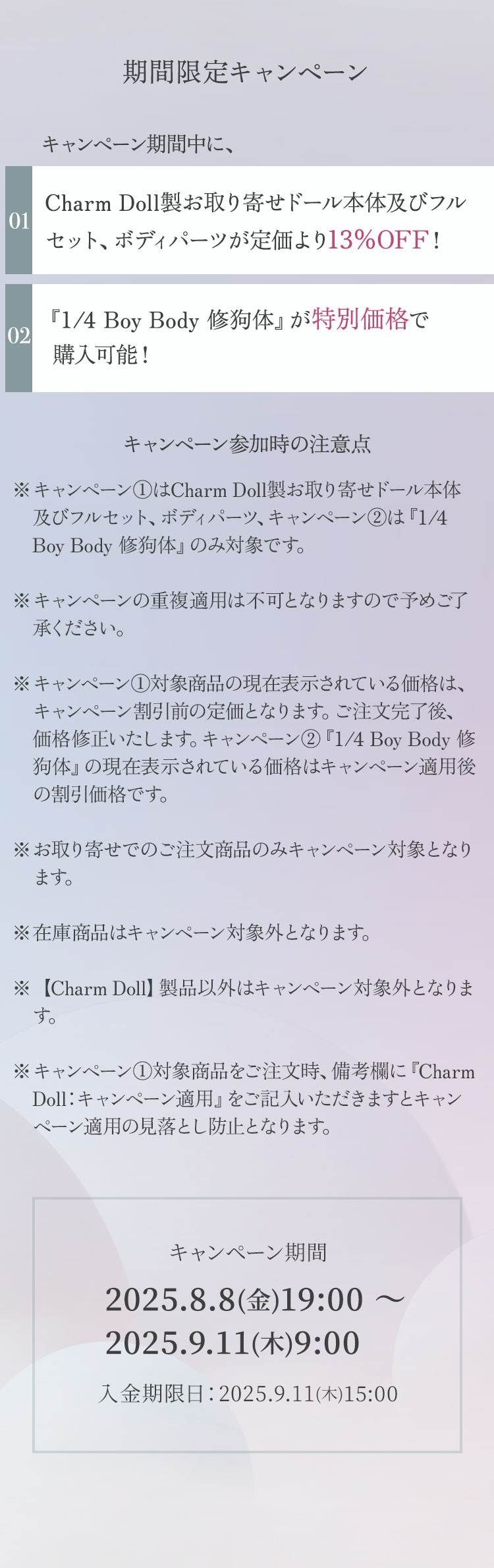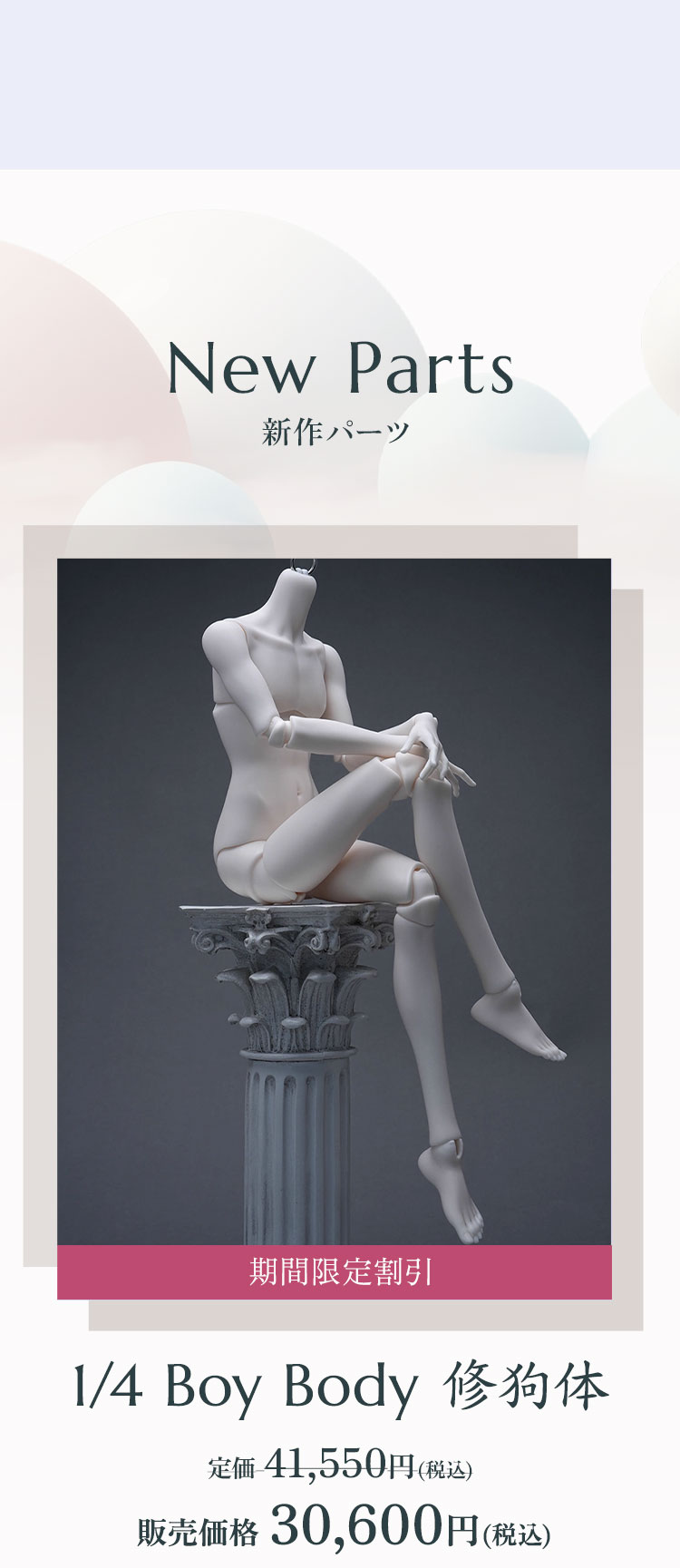 期間限定キャンペーン:キャンペーン期間中に、 ①Charm Doll製お取り寄せドール本体及びフルセット、ボディパーツが定価より【13%OFF】! ②『1/4 Boy Body 修狗体』が【特別価格】で購入可能!