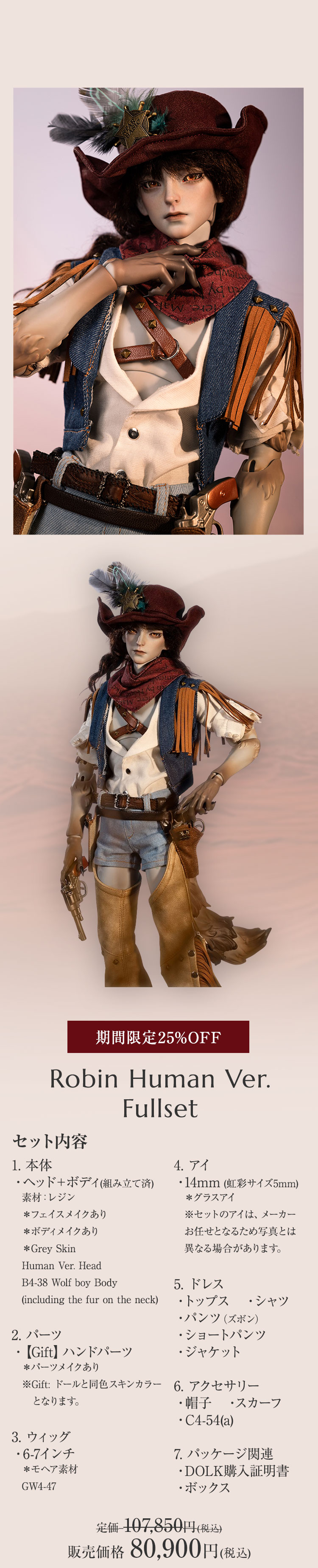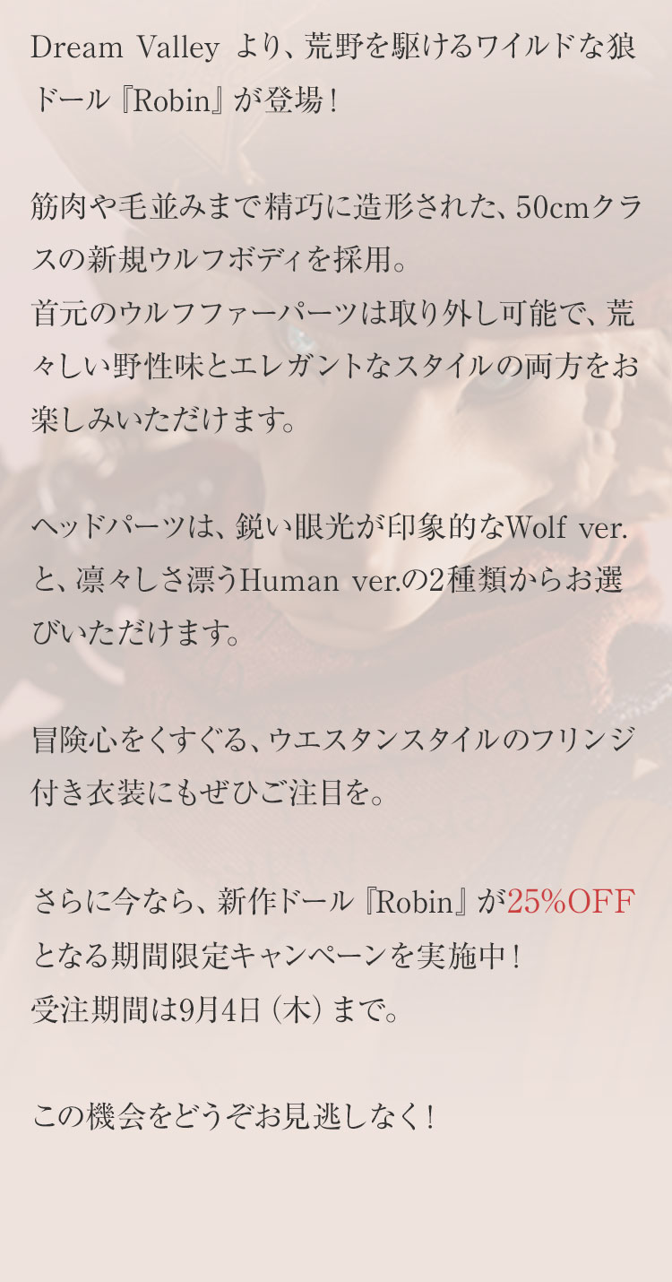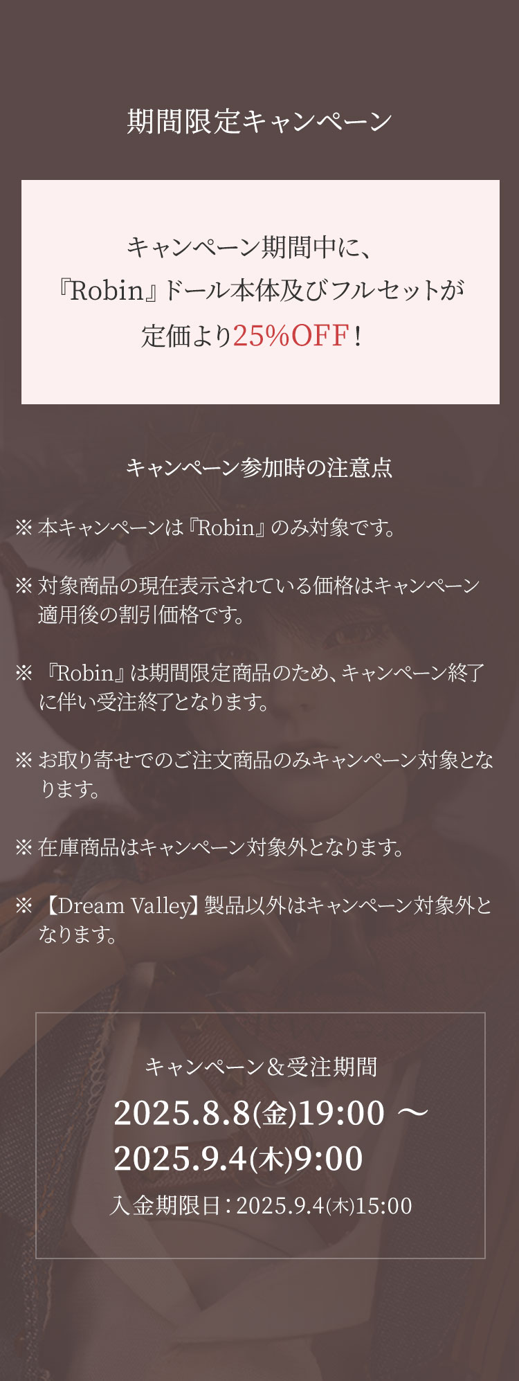 期間限定キャンペーン:キャンペーン期間中に、『Robin』ドール本体及びフルセットが定価より【25%OFF】!