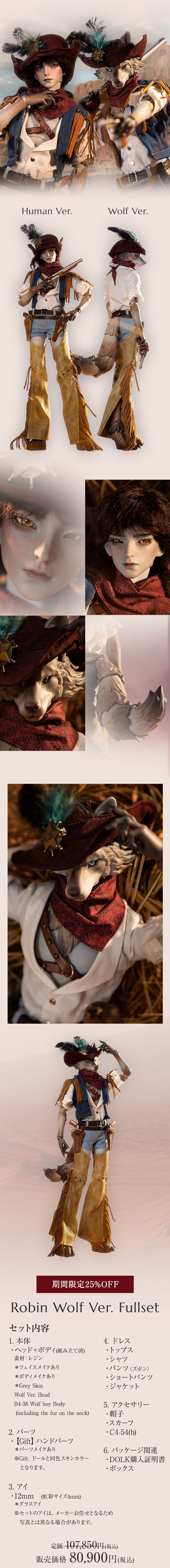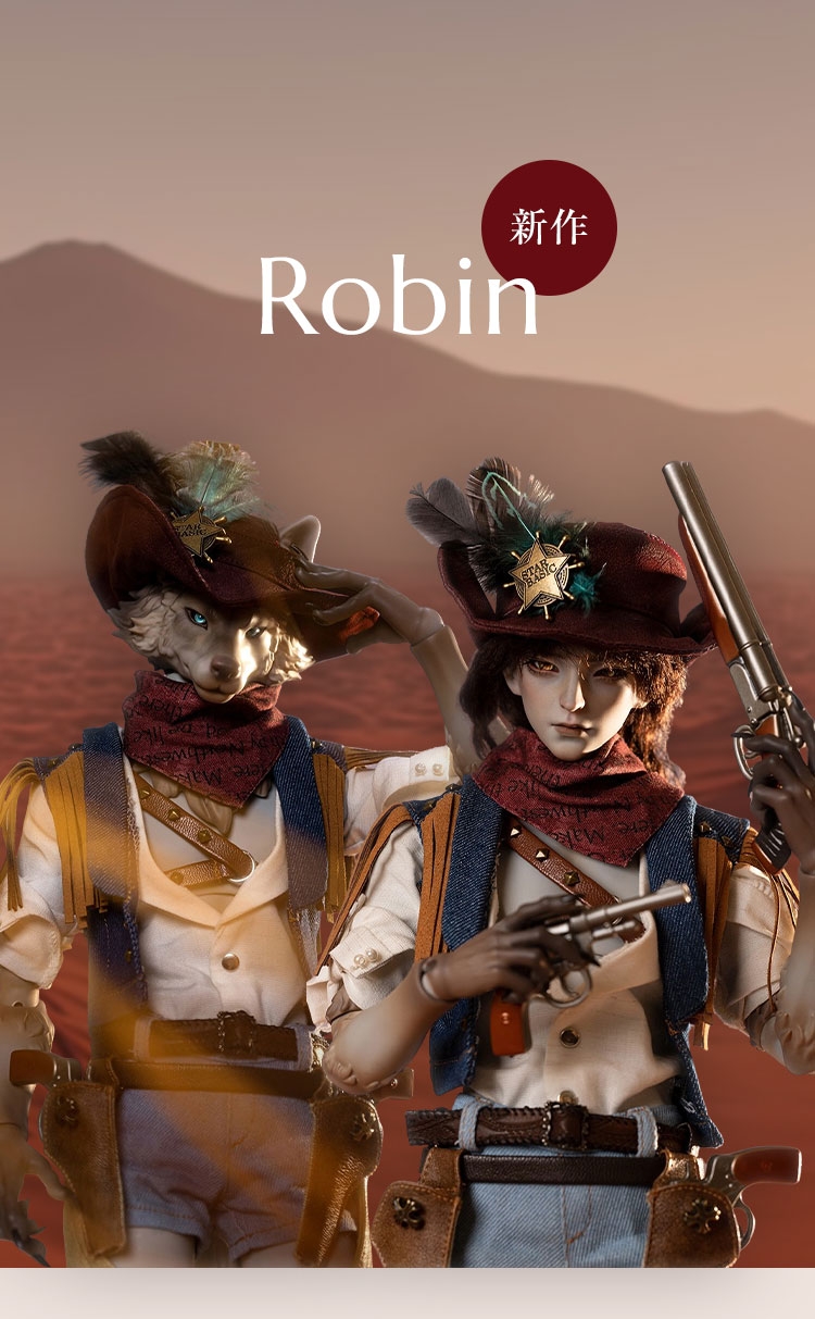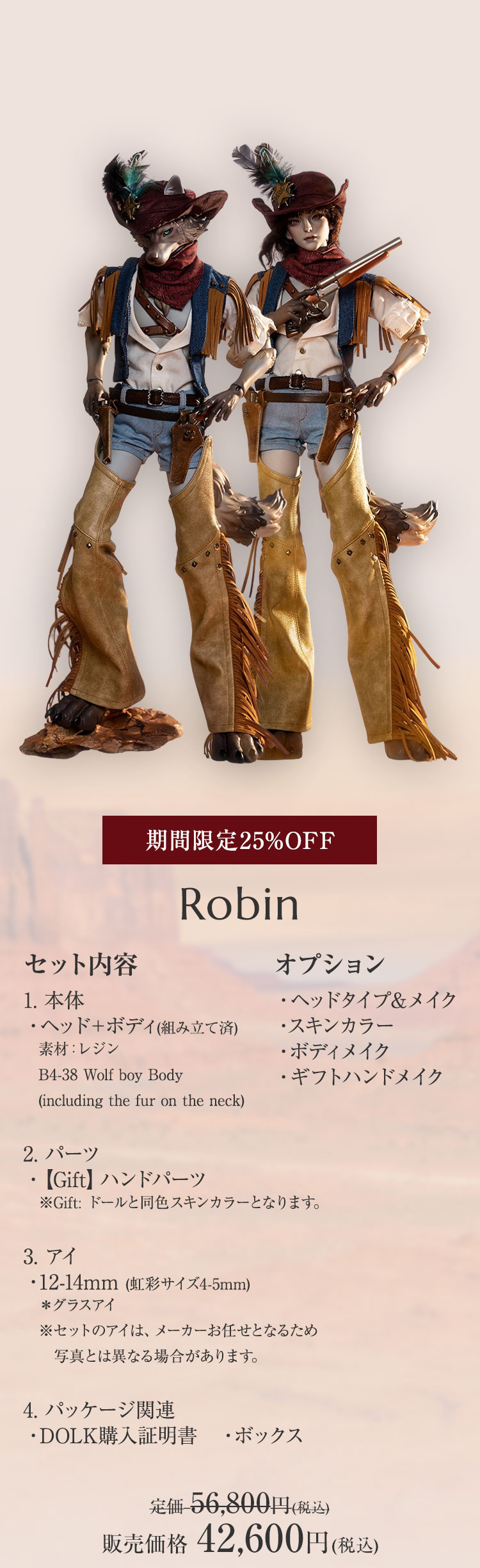 筋肉や毛並みまで精巧に造形された、50cmクラスの新規ウルフボディを採用。 首元のウルフファーパーツは取り外し可能で、荒々しい野性味とエレガントなスタイルの両方をお楽しみいただけます。 ヘッドパーツは、鋭い眼光が印象的なWolf ver.と、凛々しさ漂うHuman ver.の2種類からお選びいただけます。 冒険心をくすぐる、ウエスタンスタイルのフリンジ付き衣装にもぜひご注目を。 さらに今なら、新作ドール『Robin』が25%OFFとなる期間限定キャンペーンを実施中! 受注期間は9月4日(木)まで。 この機会をどうぞお見逃しなく!
