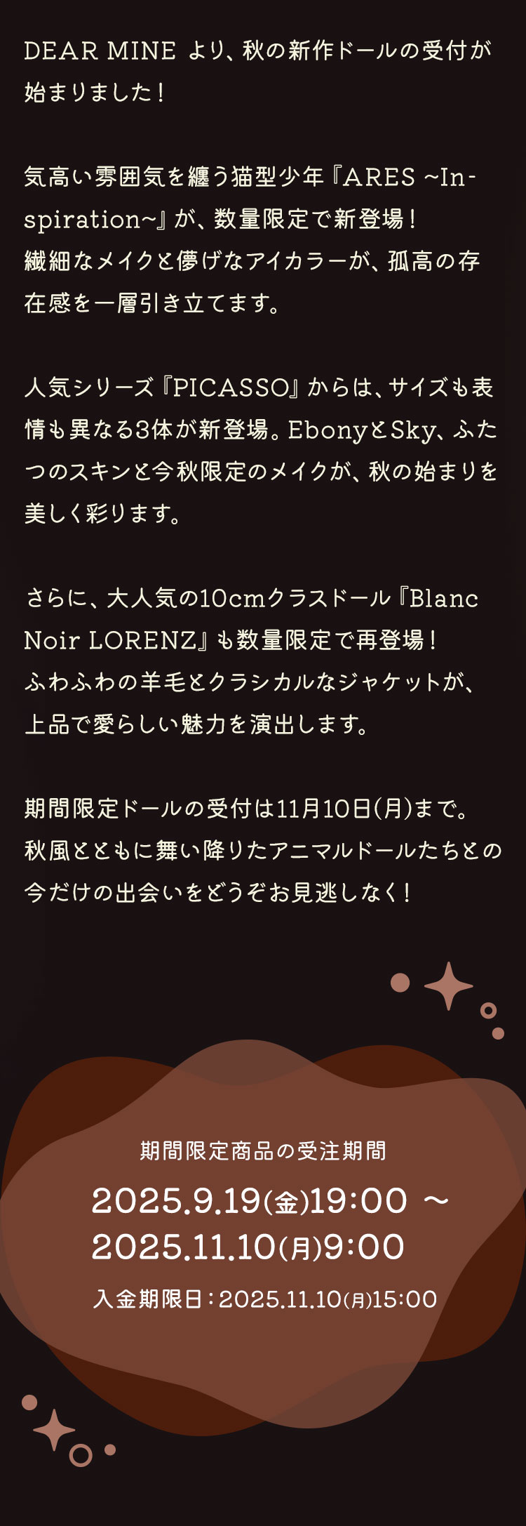 気高い雰囲気を纏う猫型少年『ARES ~Inspiration~』が、数量限定で新登場! 繊細なメイクと儚げなアイカラーが、孤高の存在感を一層引き立てます。 人気シリーズ『PICASSO』からは、サイズも表情も異なる3体が新登場。 EbonyとSky、ふたつのスキンと今秋限定のメイクが、秋の始まりを美しく彩ります。 さらに、大人気の10cmクラスドール『Blanc Noir LORENZ』も数量限定で再登場! ふわふわの羊毛とクラシカルなジャケットが、上品で愛らしい魅力を演出します。 期間限定ドールの受付は11月10日(月)まで。 秋風とともに舞い降りたアニマルドールたちとの今だけの出会いをどうぞお見逃しなく!