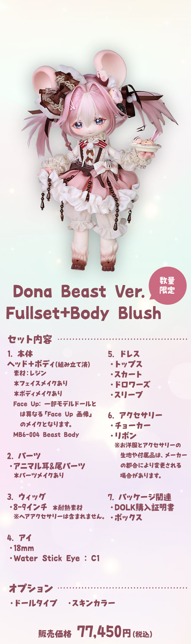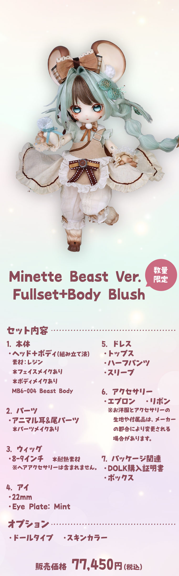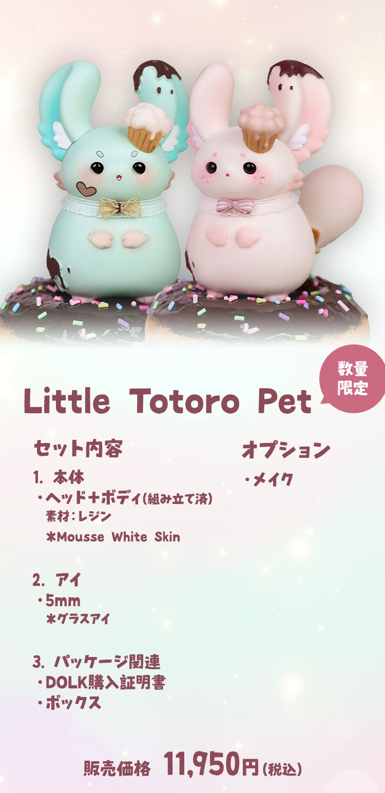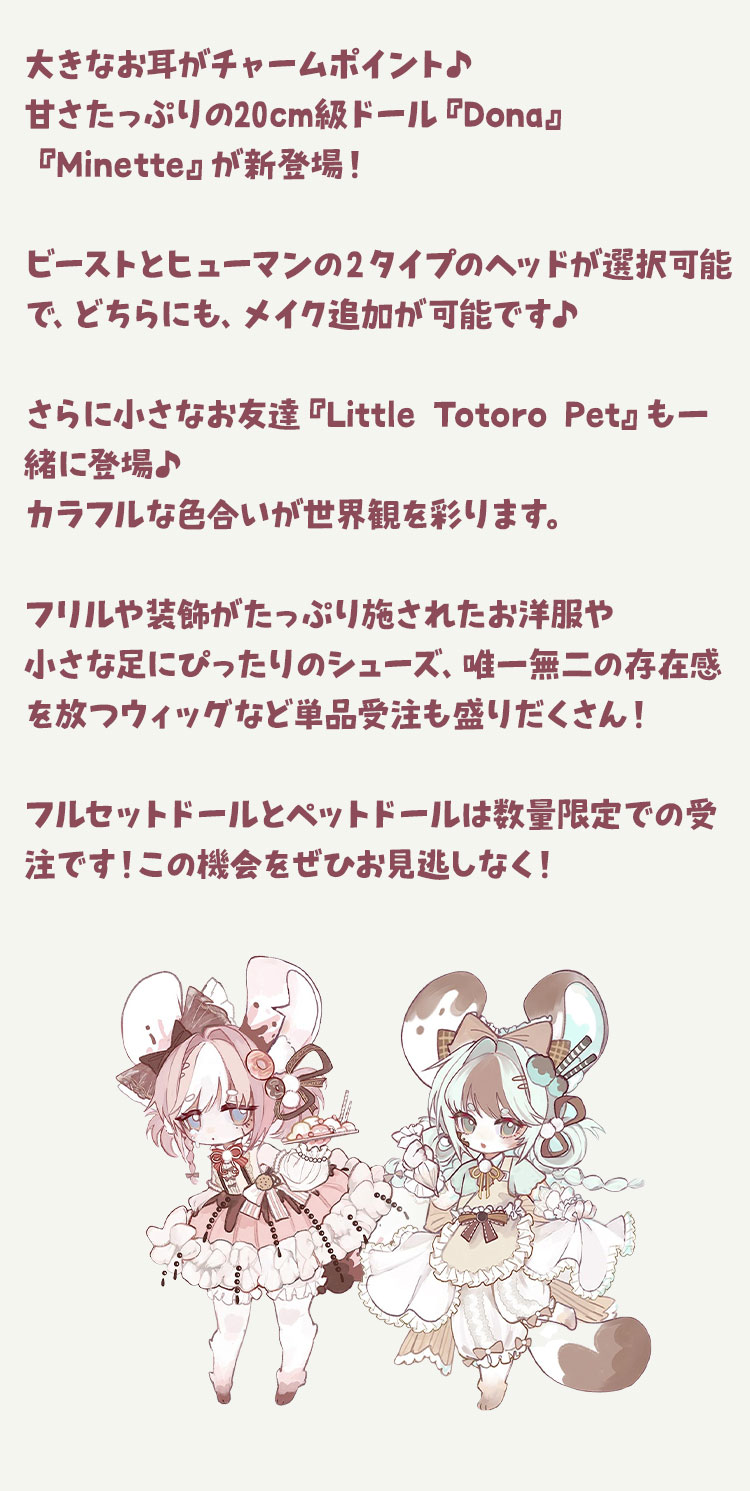 ビーストとヒューマンの2タイプのヘッドが選択可能で、 どちらにも、メイク追加が可能です♪ さらに小さなお友達『Little Totoro Pet』も一緒に登場♪ カラフルな色合いが世界観を彩ります。 フリルや装飾がたっぷり施されたお洋服や 小さな足にぴったりのシューズ、唯一無二の存在感を放つウィッグなど 単品受注も盛りだくさん! フルセットドールとペットドールは数量限定での受注です! この機会をぜひお見逃しなく!