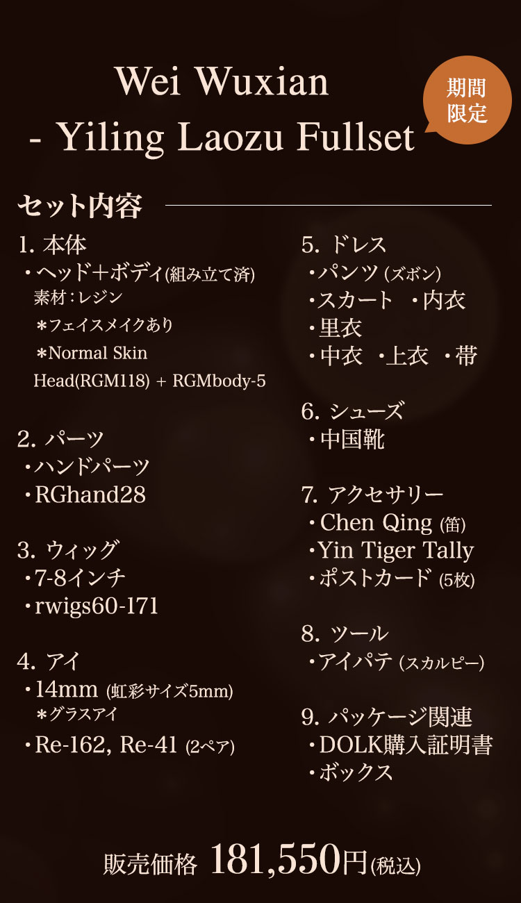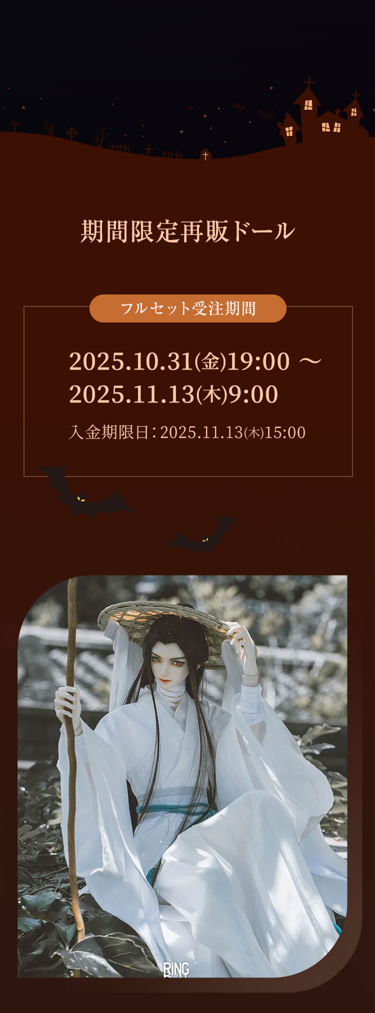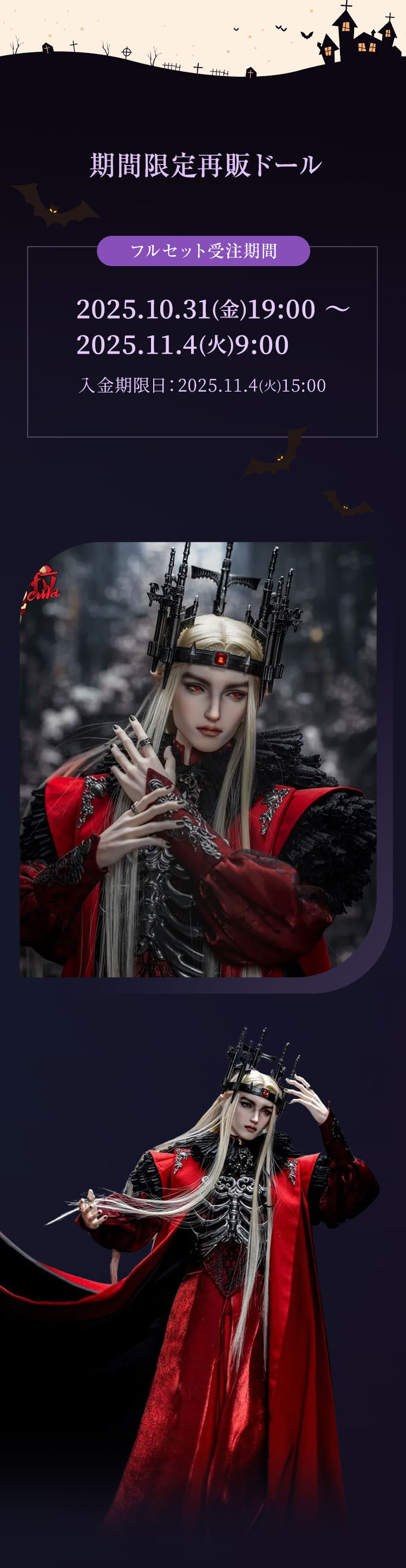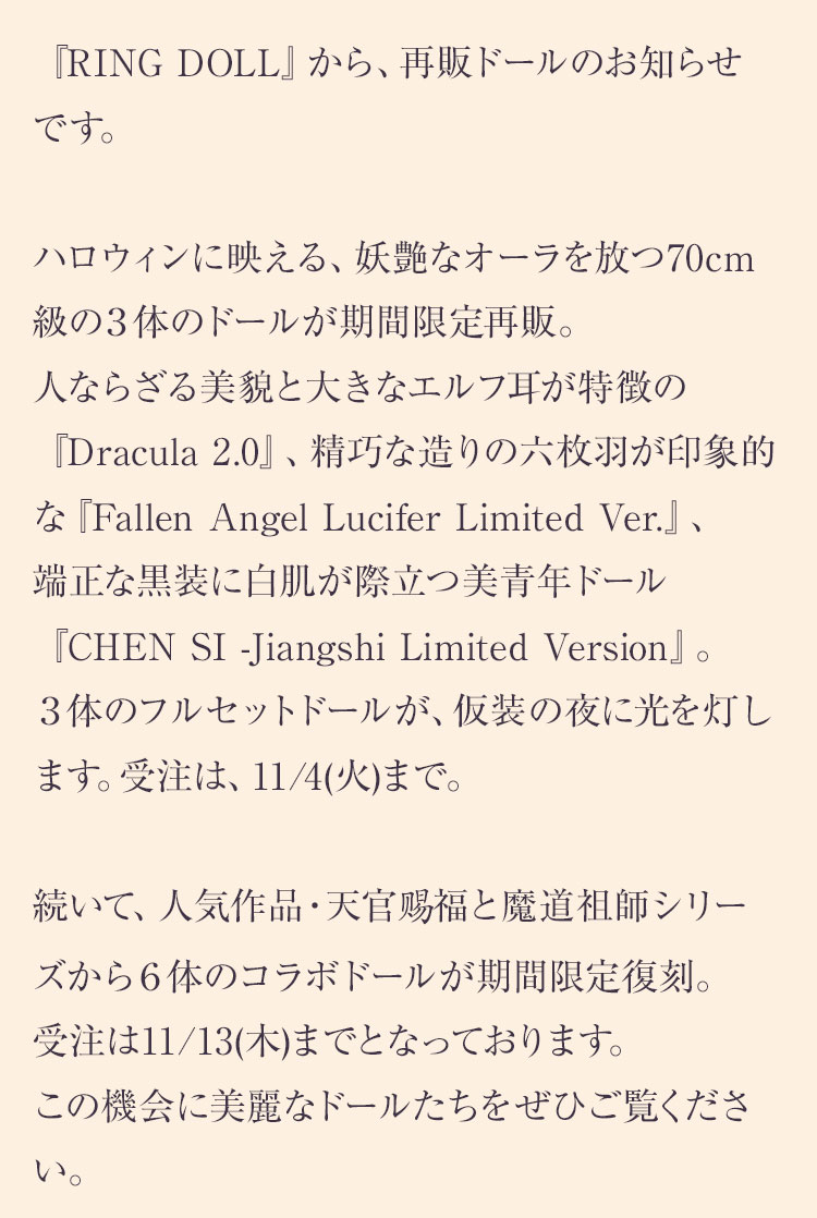 ハロウィンに映える、妖艶なオーラを放つ70cm級の3体のドールが期間限定再販。 人ならざる美貌と大きなエルフ耳が特徴の『Dracula 2.0』、 精巧な造りの六枚羽が印象的な『Fallen Angel Lucifer Limited Ver.』、 端正な黒装に白肌が際立つ美青年ドール『CHEN SI -Jiangshi Limited Version』。 3体のフルセットドールが、仮装の夜に光を灯します。 受注は、11/4(火)まで。 続いて、人気作品・天官赐福と魔道祖師シリーズから6体のコラボドールが期間限定復刻。 受注は11/13(木)までとなっております。 この機会に美麗なドールたちをぜひご覧ください。