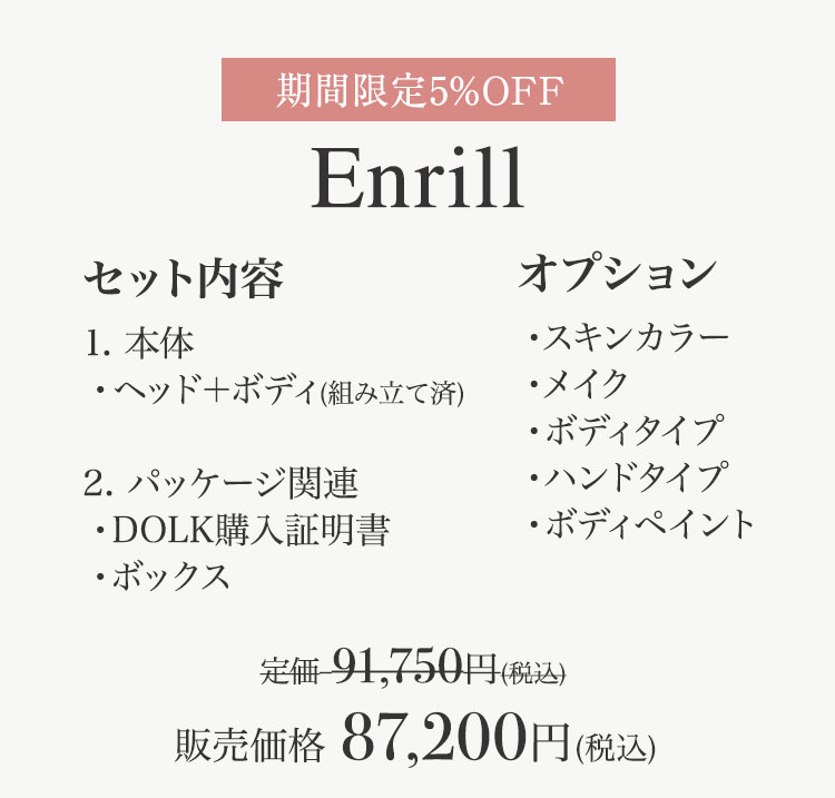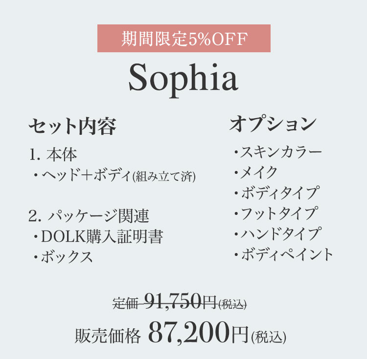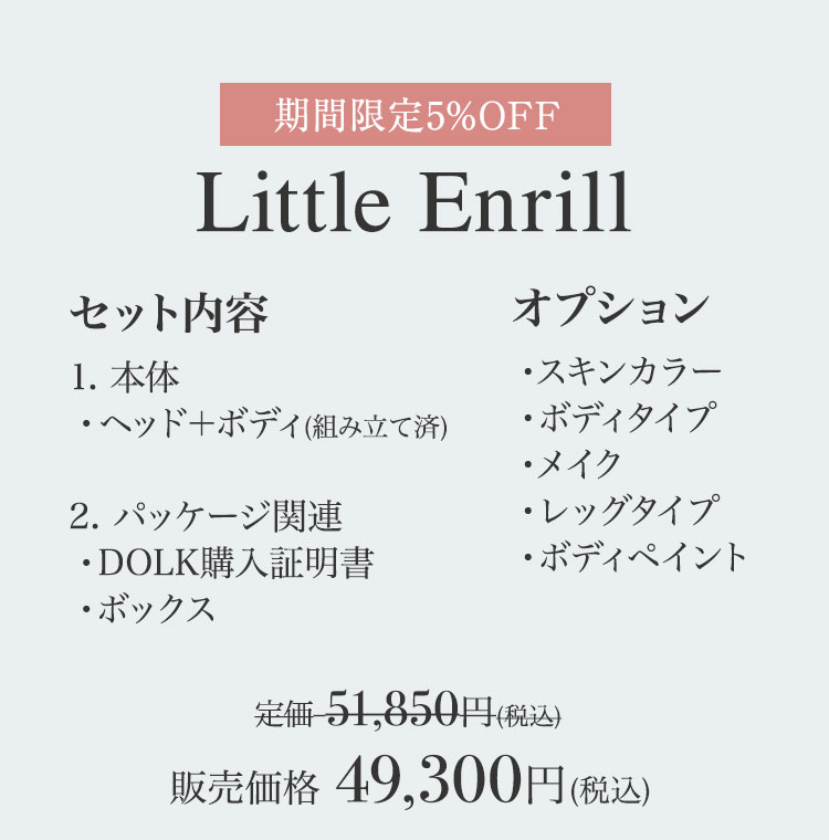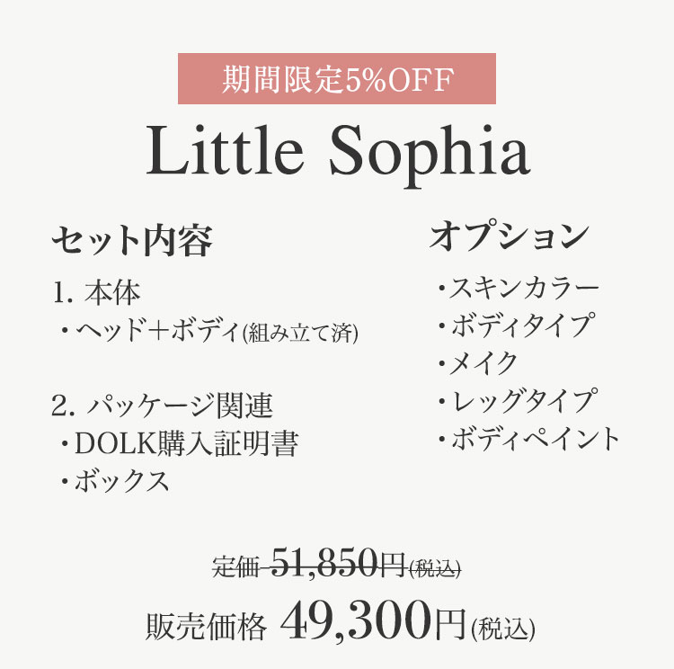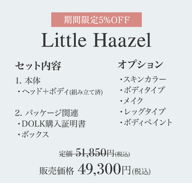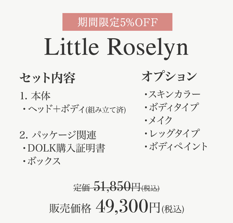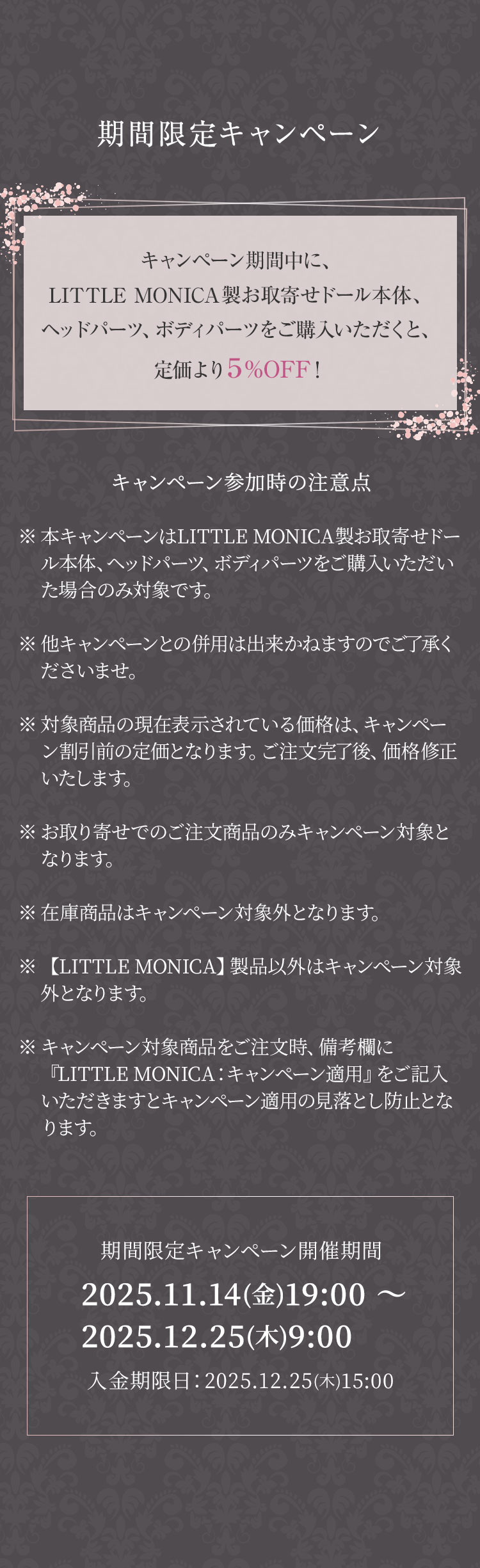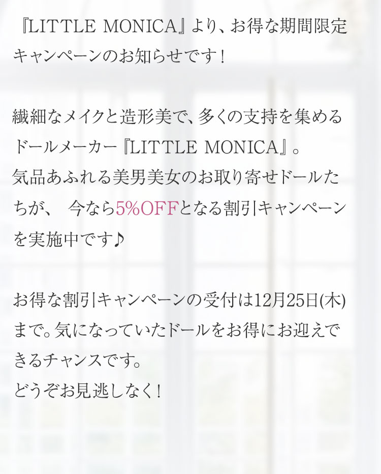 キャンペーン期間中に、LITTLE MONICA製お取寄せドール本体、ヘッドパーツ、ボディパーツをご購入いただくと定価より【5%OFF】!