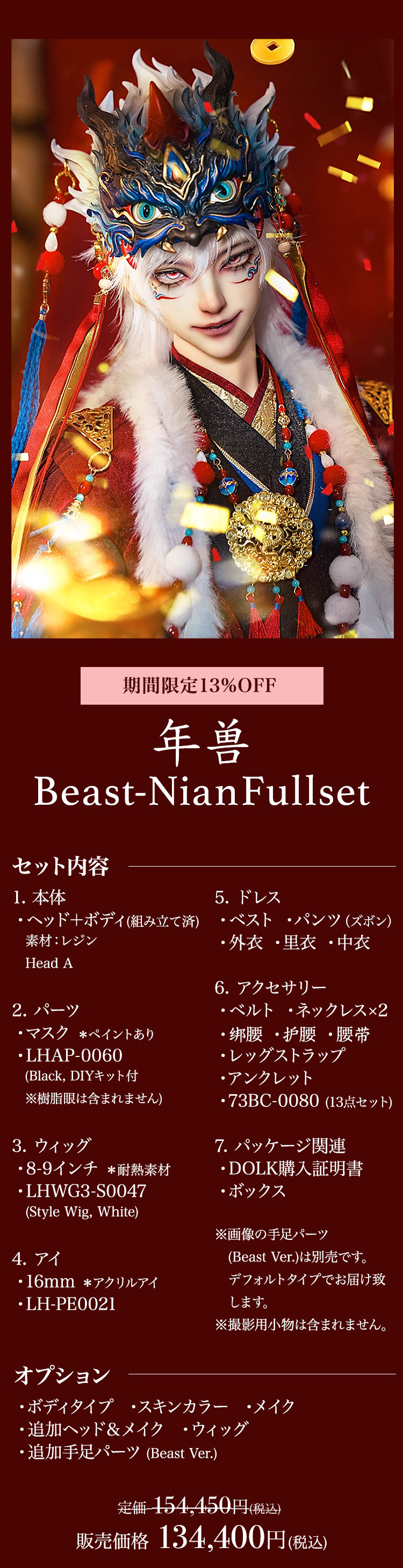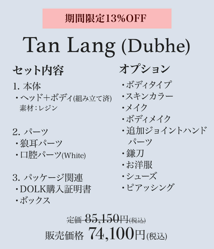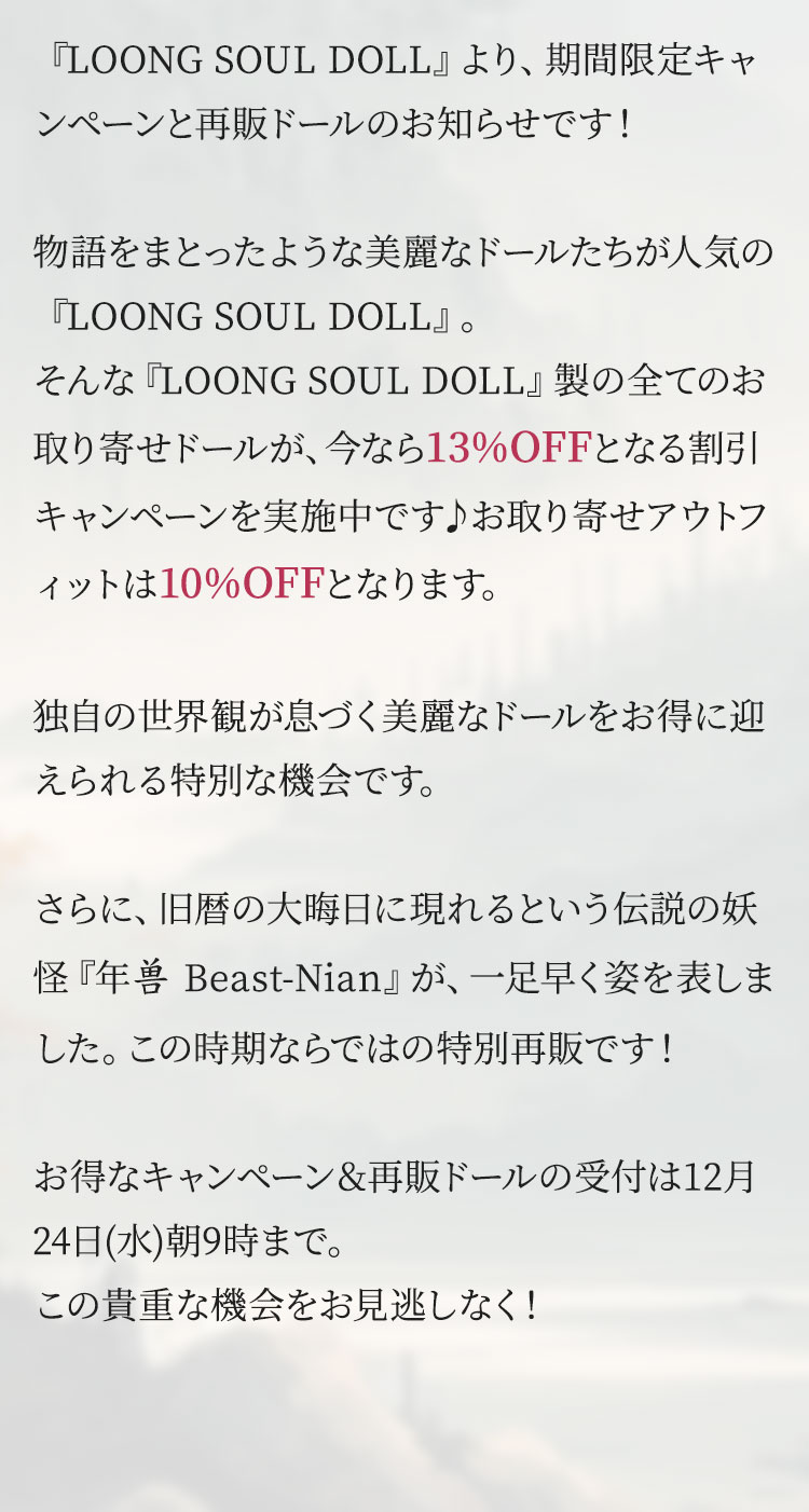 物語をまとったような美麗なドールたちが人気の『LOONG SOUL DOLL』。 そんな『LOONG SOUL DOLL』製の全てのお取り寄せドールが、 今なら 13%OFF となる割引キャンペーンを実施中です♪ お取り寄せアウトフィットは 10%OFF となります。 独自の世界観が息づく美麗なドールをお得に迎えられる特別な機会です。 さらに、旧暦の大晦日に現れるという伝説の妖怪『年兽 Beast-Nian』が、一足早く姿を表しました。 この時期ならではの特別再販です! お得なキャンペーン&再販ドールの受付は12月24日(水)朝9時まで。 この貴重な機会をお見逃しなく!